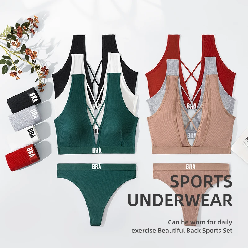 OEM women's bra set deep V suspender underwear thong set hollowed out to beautify the back breathable comfortable and shockproof