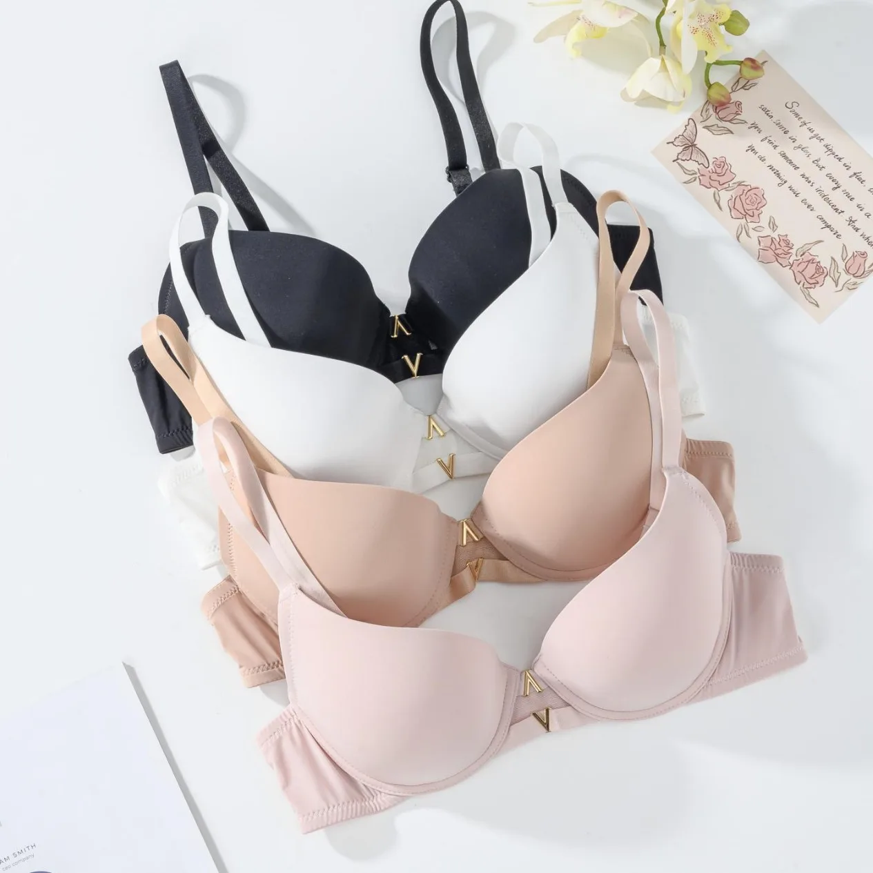 Women's Sexy V-Shape Bras Comfortable Adjustable Underwear with Embroidered Rims and Back Buttons Fashionable Accessories
