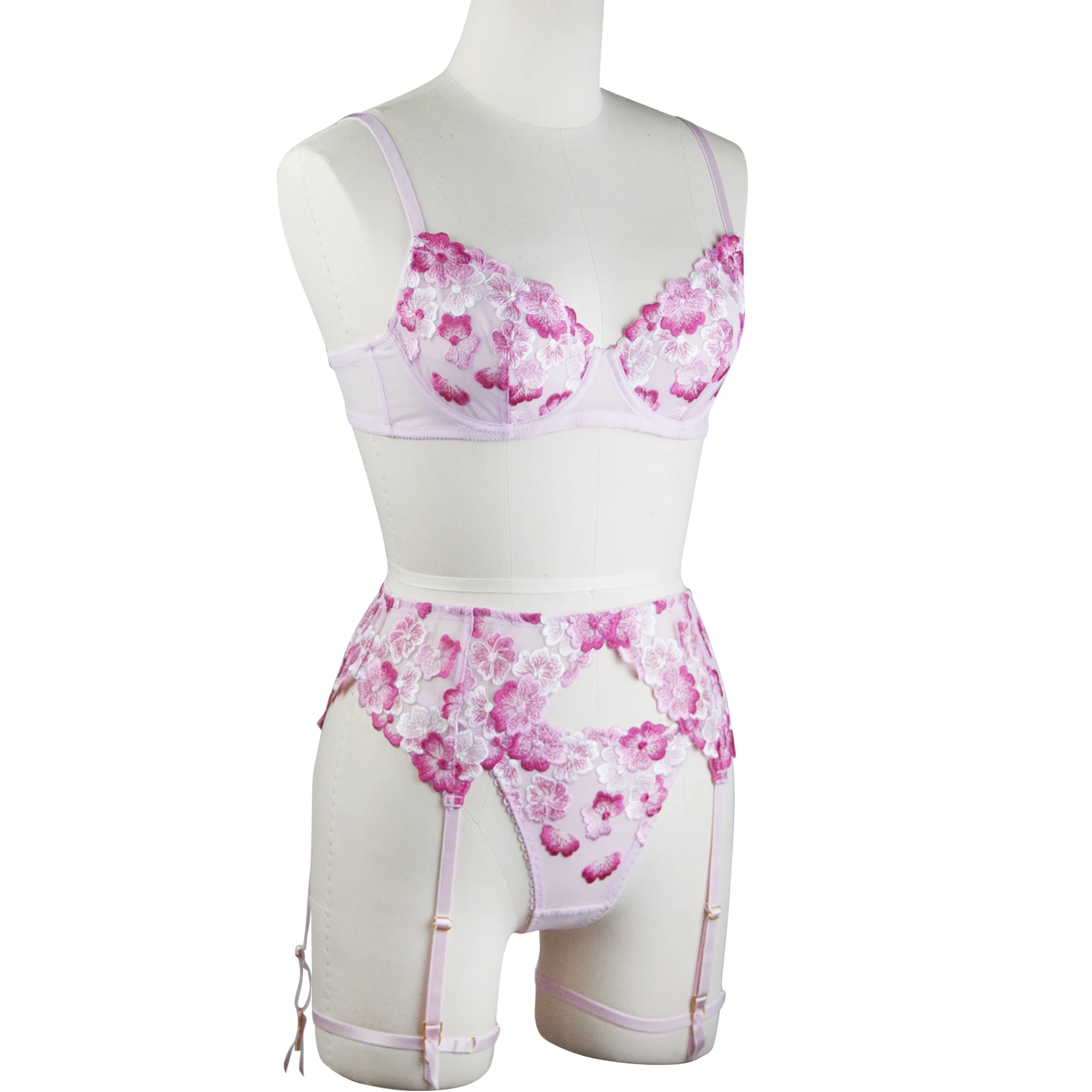 Customized Embroidery Lace Bra Set for Ladies with High Quality Bra Panty and Garter Belts in Hot Sexy Style Women Underwear