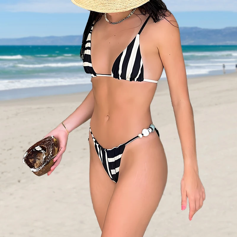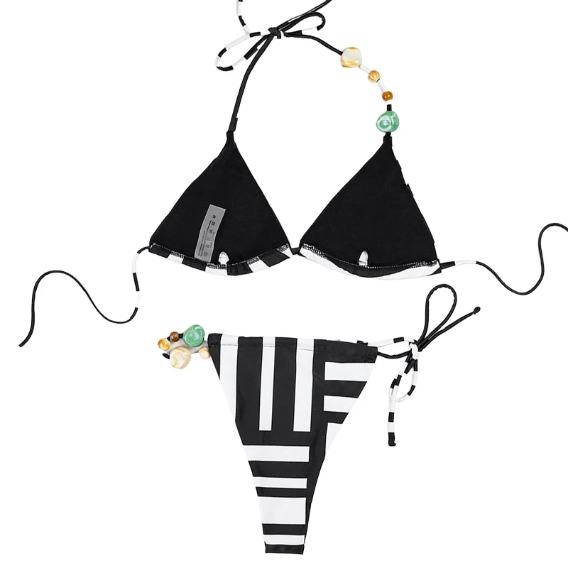 Women's Sexy High-Waisted V-neck Triangle Bra Bikini 2-Piece Sets Striped Printed Bead Swimwear Seamless OEM Service Available