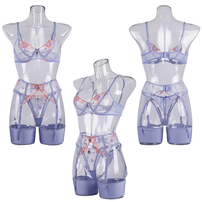 Craftsmanship Embroidery Mesh Splicing Three Piece Body Shaping Split Lingerie Set See-Through Underwear Lace Bow Decorations
