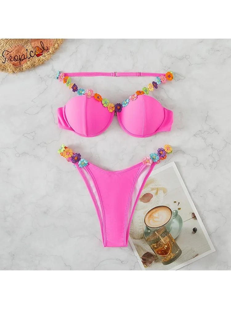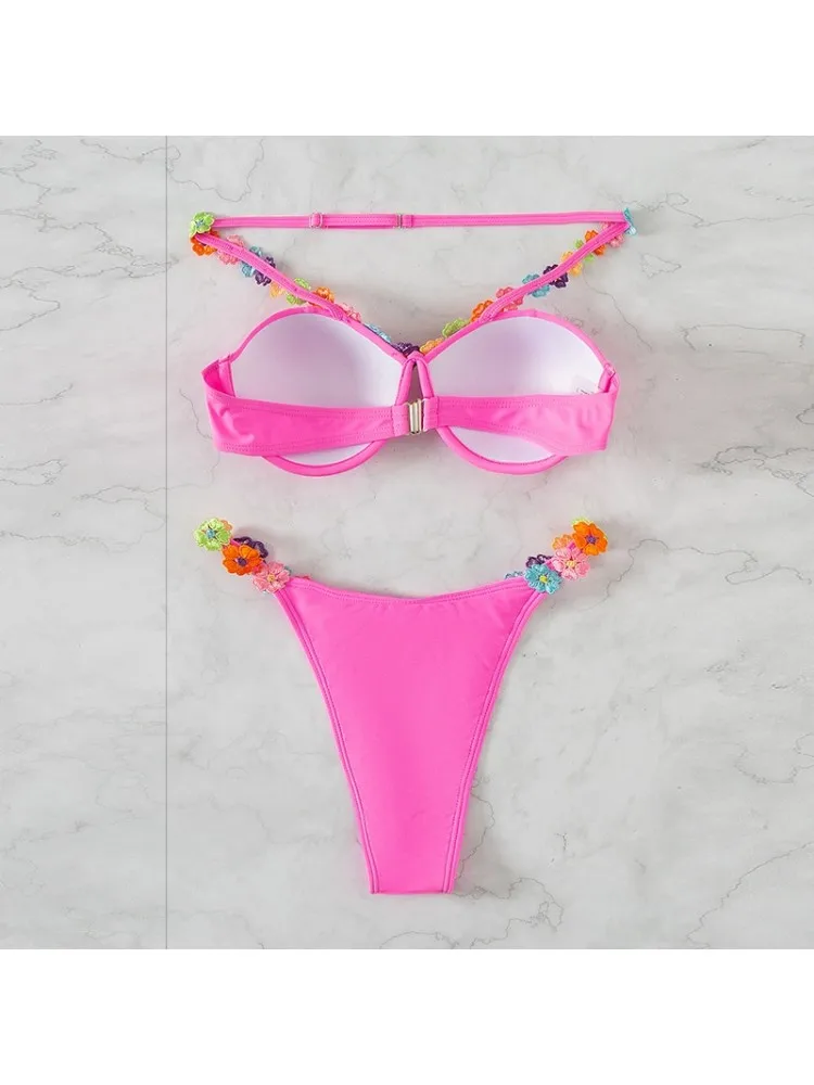 Woman Solid Colors Bikinis Trending Two Piece High Waist Floral Print Beachwear Swimwear