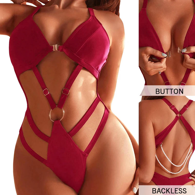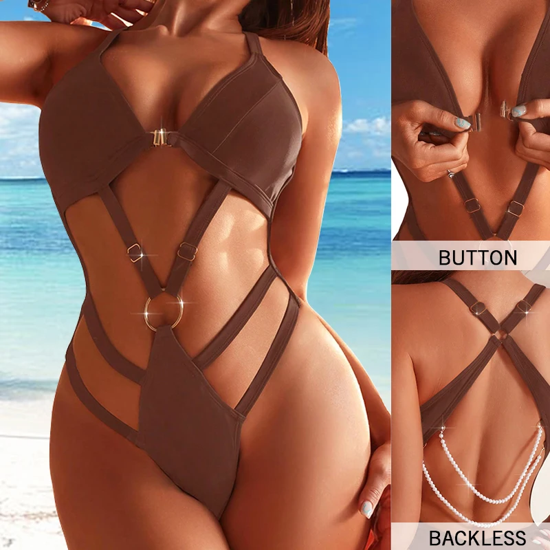 Backless Design Quick - Drying Comfortable Beachwear Stylish Women's Solid with Ring Linked High Cut One Piece Swimsuit