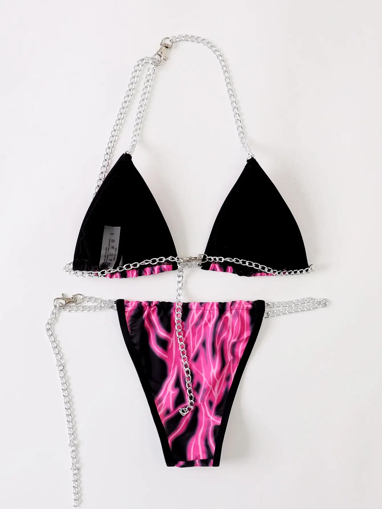 Women Sexy Lightning Print Cut Out Bathing Suit Chain Linked Thong Bikini Swimsuit