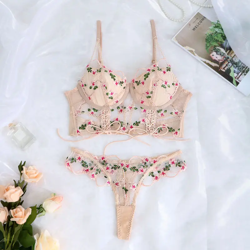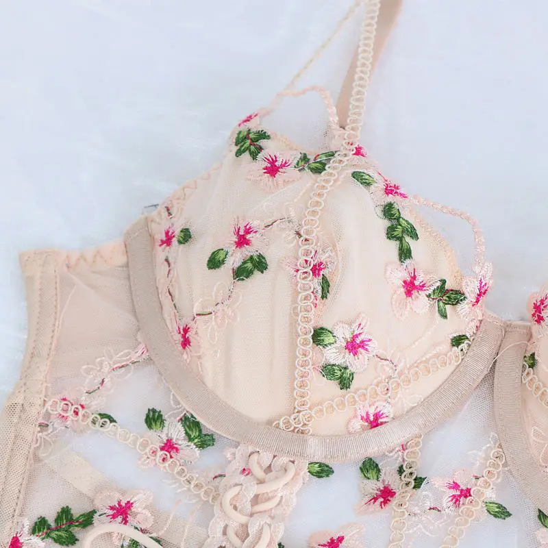 Custom Mature Busty Underwire Bra Sexy Mesh Flower Lace Floral Embroidery Erotic Transparent Lingerie for Woman