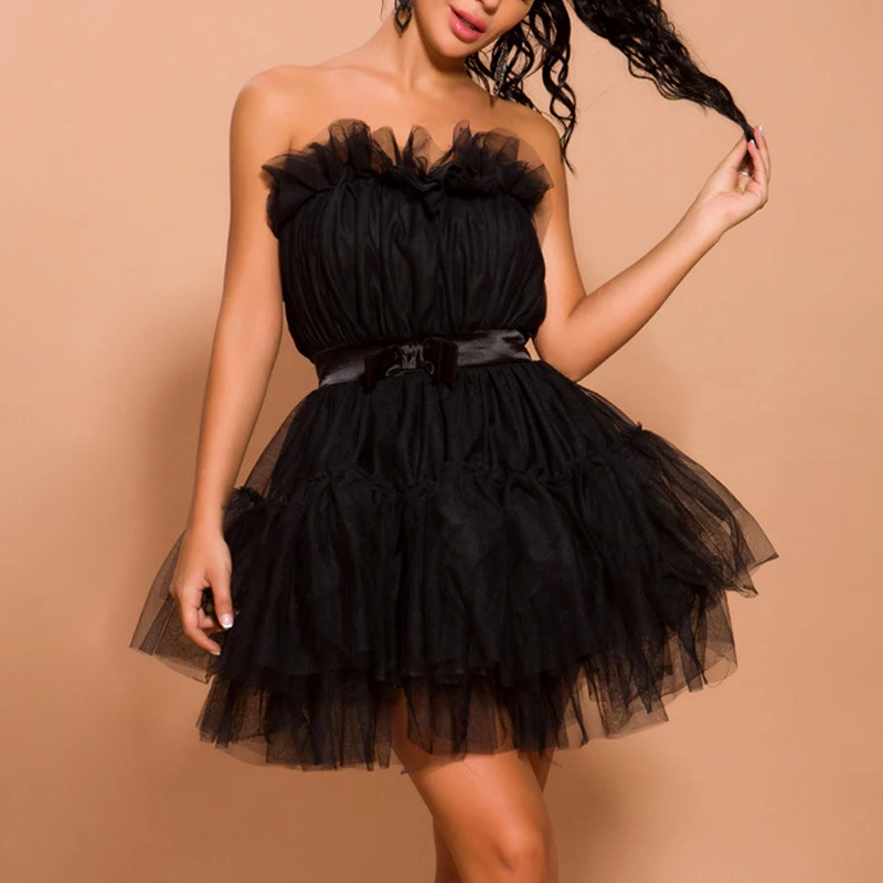 Sexy Strapless Net Yarn Plaid Pleated Skirt Women Short Party Dresses