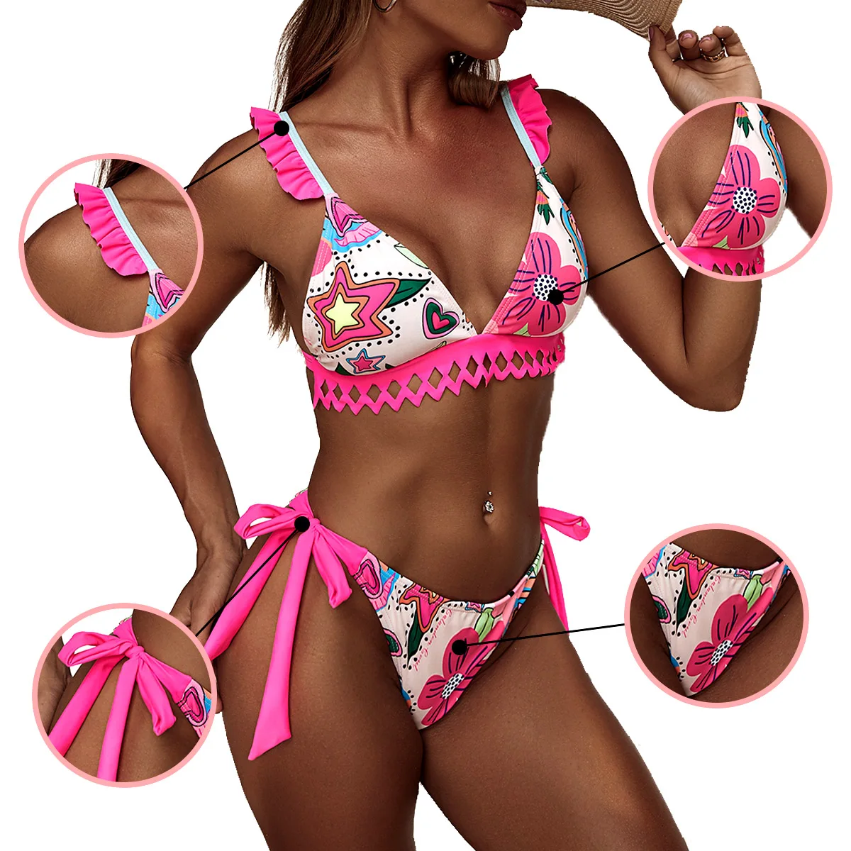 Fashion Custom High Waisted Sexy Swimwear Cutout String Bikini Sets Cartoon Print Girl Swimsuits Flower Swimming Suits