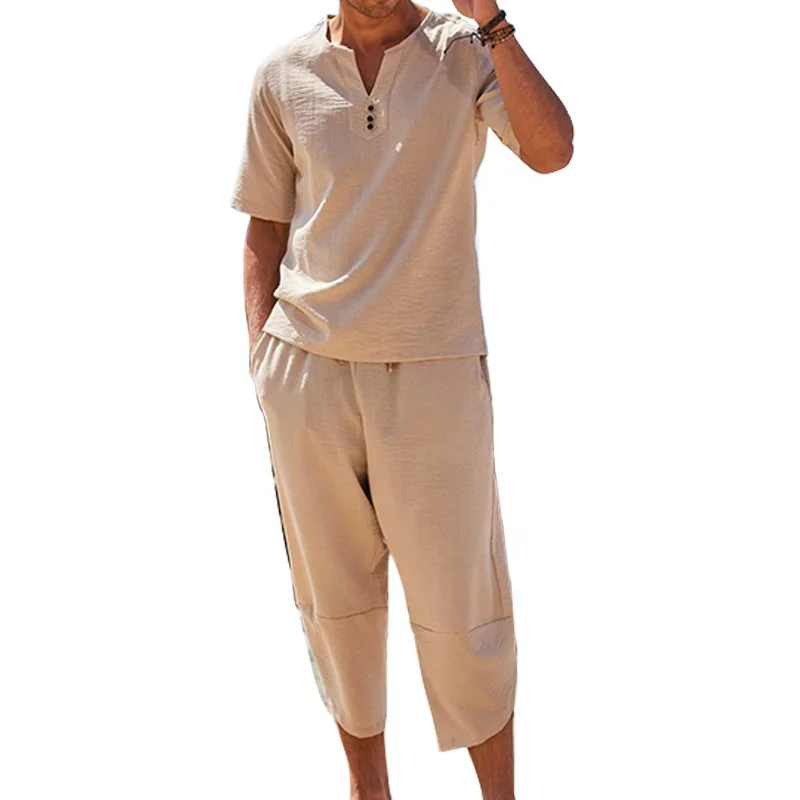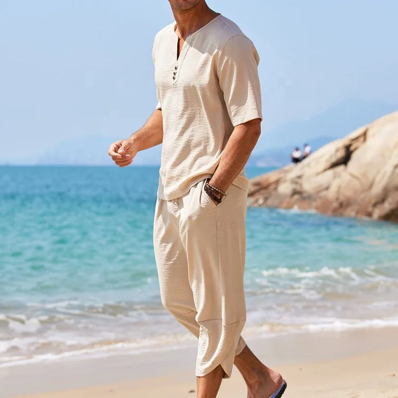 Custom Solid Color O-Neck Cotton Linen Breathable Short Sleeve Suit for Men Two Piece Beach Casual Men Suits