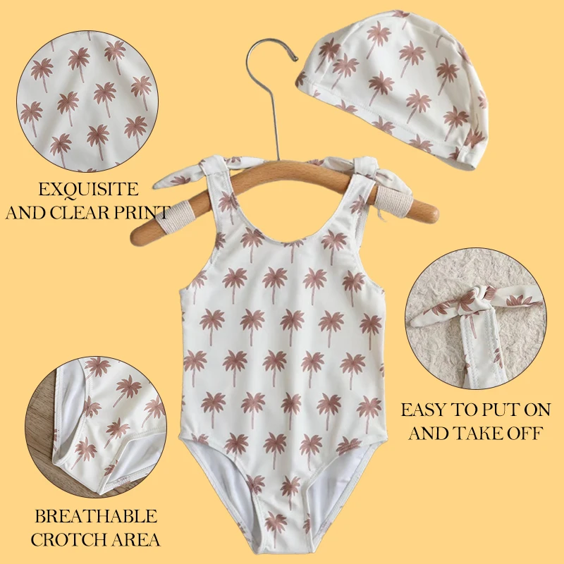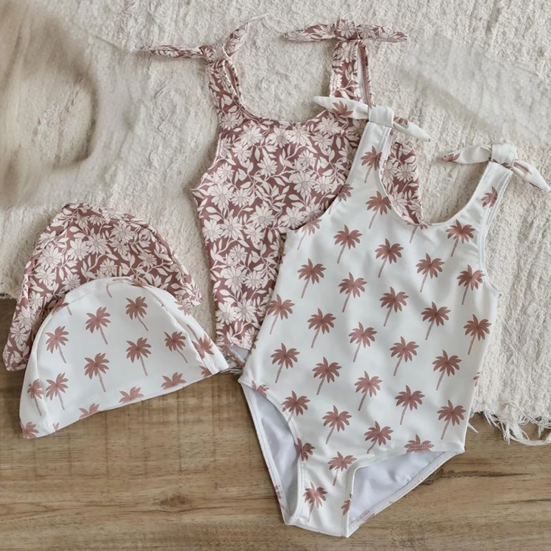 Kids Girl One-Piece Swimwear Cute Baby Girl One-Piece Swimsuit Children's Floral Suspender Swimsuit with Swimming Cap