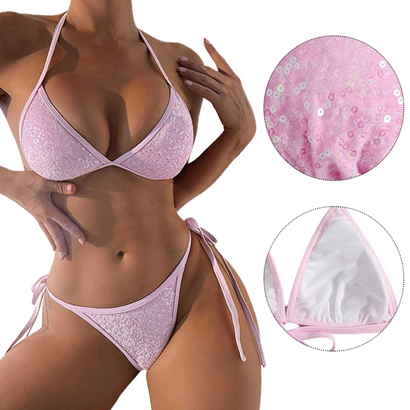 Women's 2 Piece Sparkle Bikini Sets Halter Micro Triangle Swimsuit Sequin Bathing Suit Tie Side Thongs Beachwear