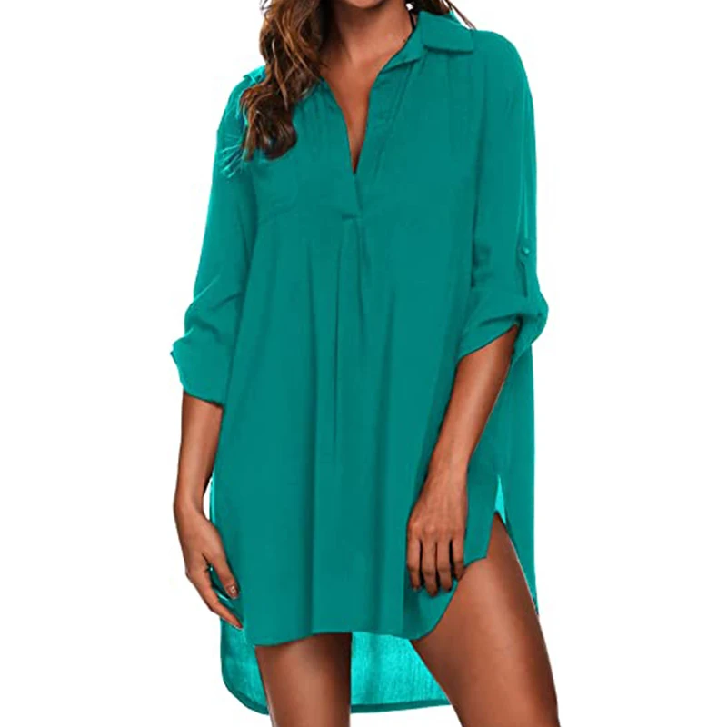 Women Solid One Piece Swim Suit V-Neck Women's Swimsuit Blouse Loose and Comfortable Beach Cover-up Ups