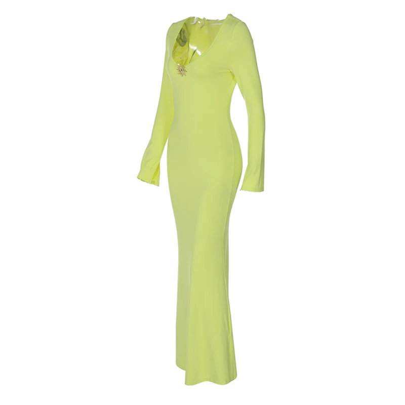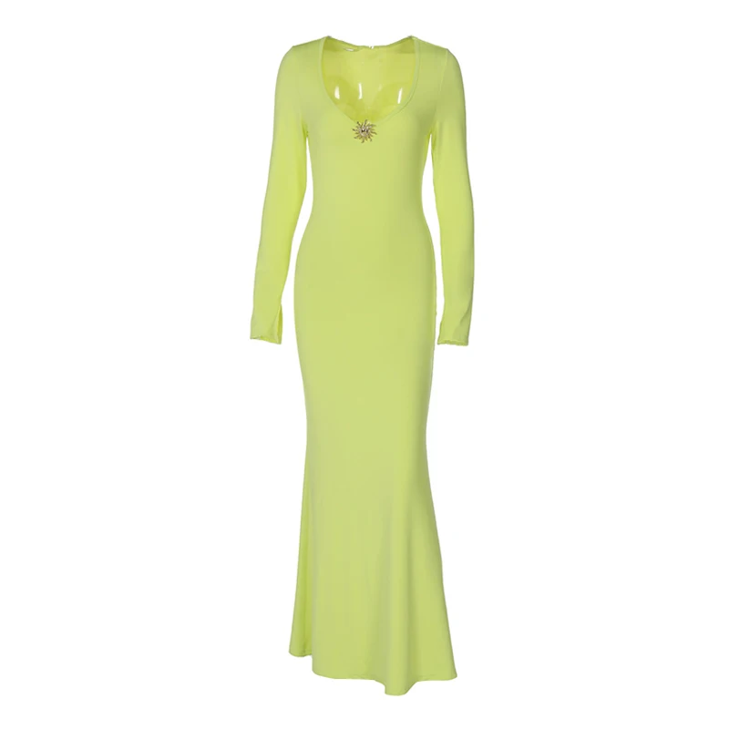 Summer New Fashionable Cyan Women'S Dress Deep U-Neck High-Waisted Fish Tail Dress Elegant Long-Sleeved Dress