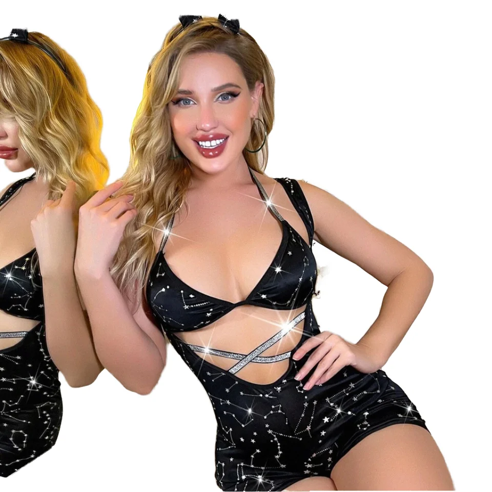 Oem Outfits Exotic Dancewear Rhinestones Stripper Clothes Lingerie Rabbit Ear Hair Band Pentagram Design Bodysuits Bondage