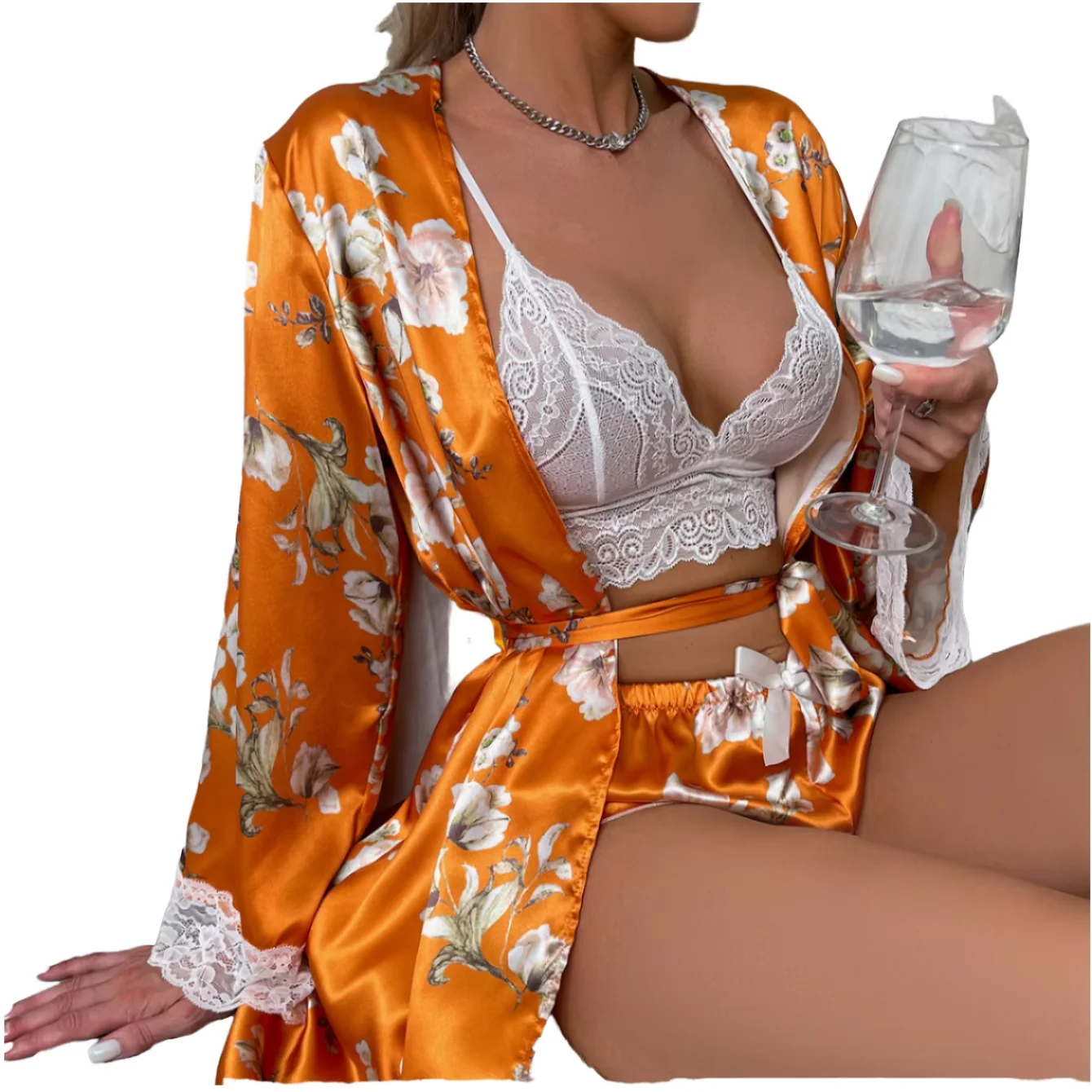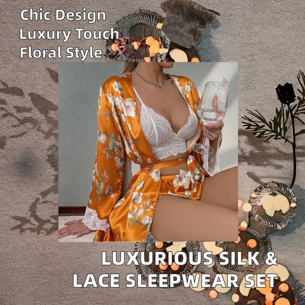 Silk Dyed Women's Sleepwear Plus Size Sexy Cardigan with Lace Casual Winter Set Featuring Drawstring Closure Luxurious Design