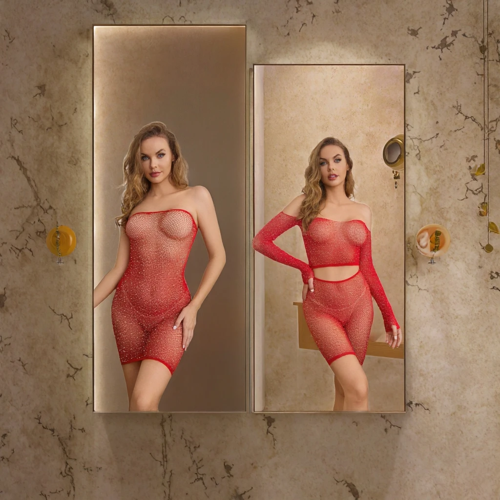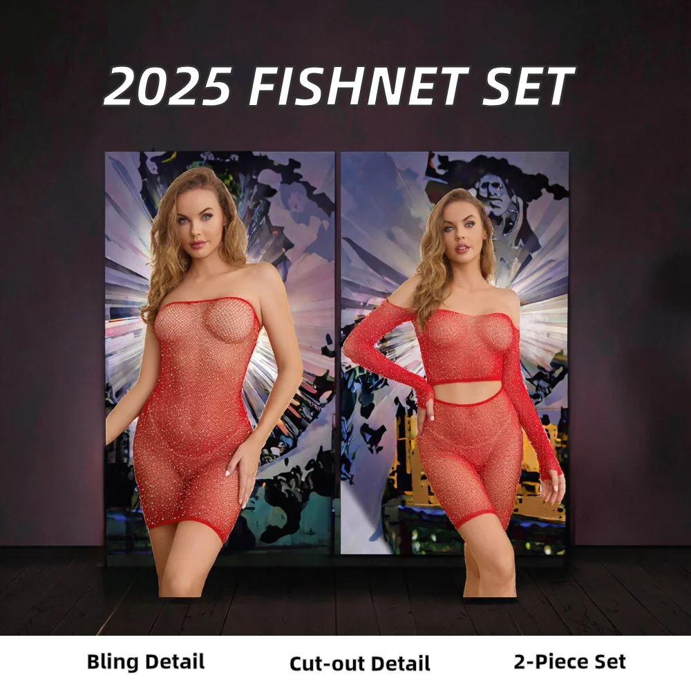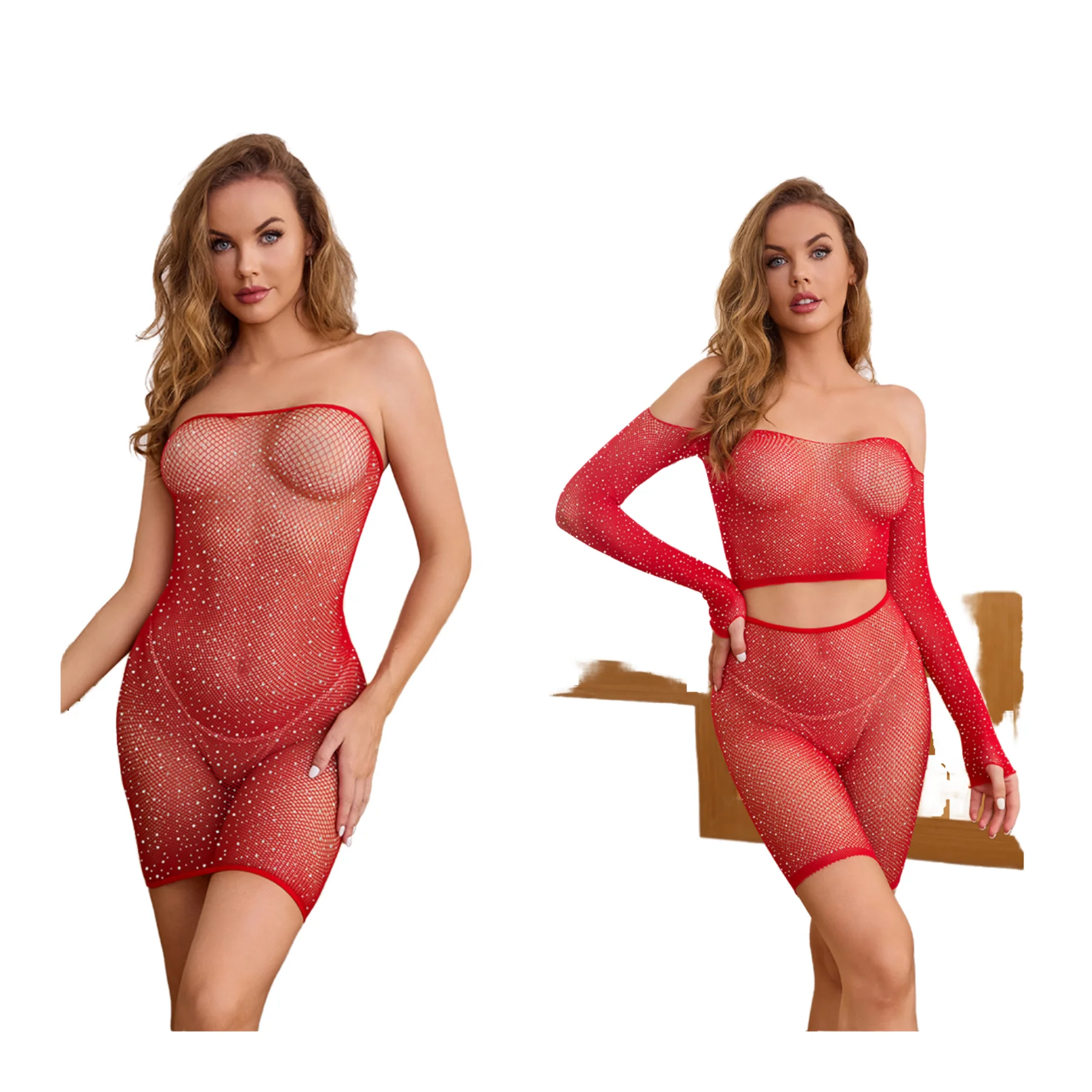 2026 Women's Sexy Underwear Set 2-Pcs Glittering Fishnet Rhinestone Dress Long Sleeves Tight Fishing Net Temptation Lingerie