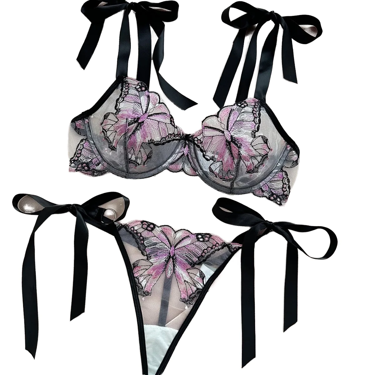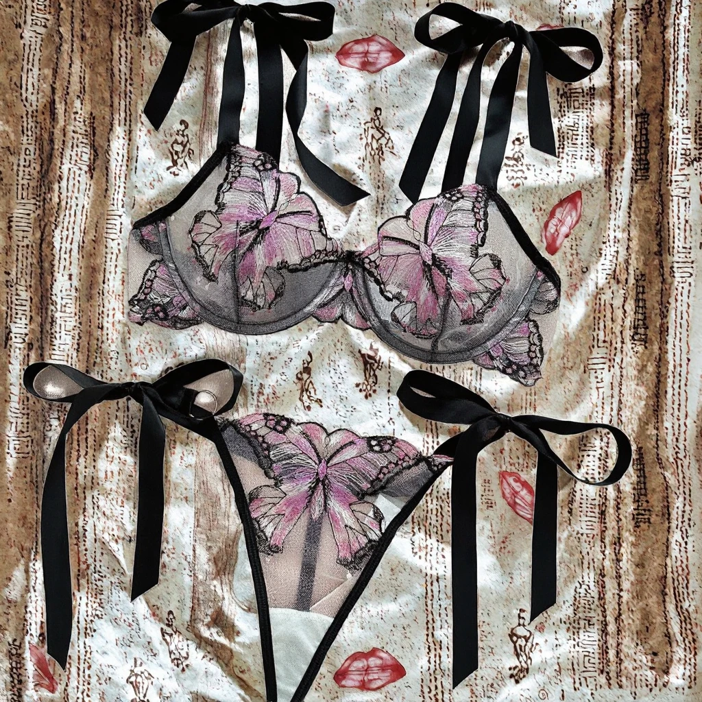Sexy Mesh Butterfly Embroidery Hollow Out Lace Firm Control Ultra-thin Women's Desire Style Perspective Four-piece Lingerie Set