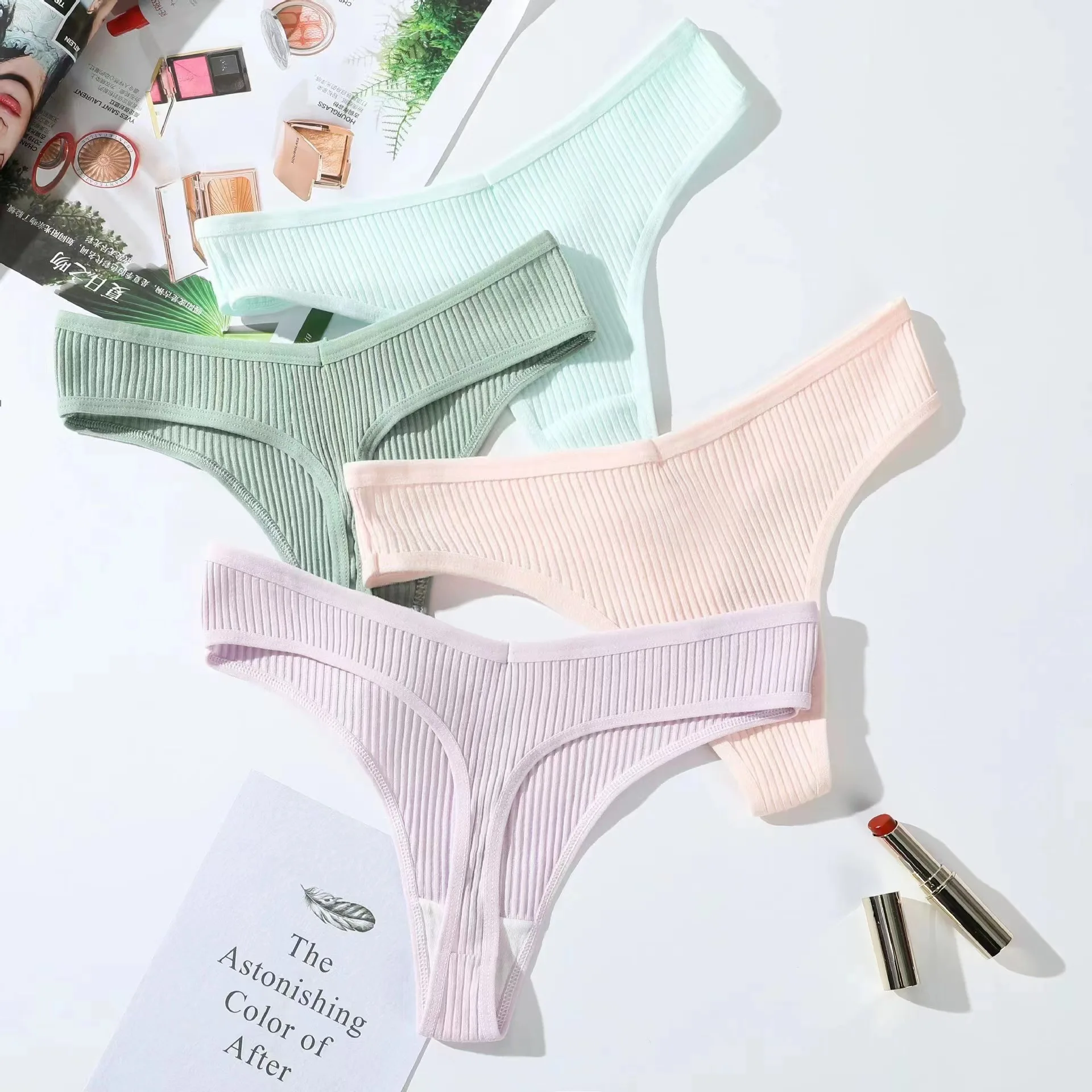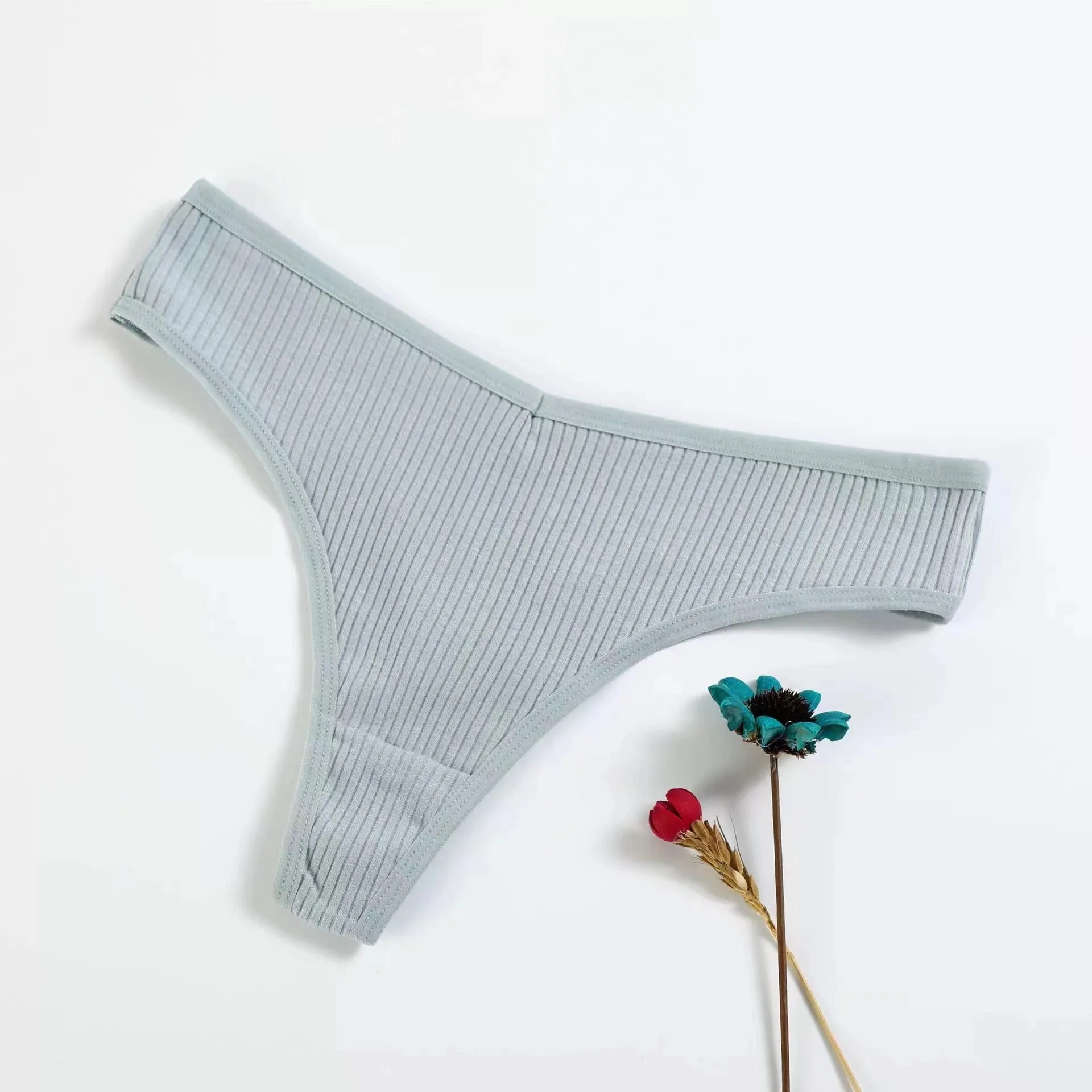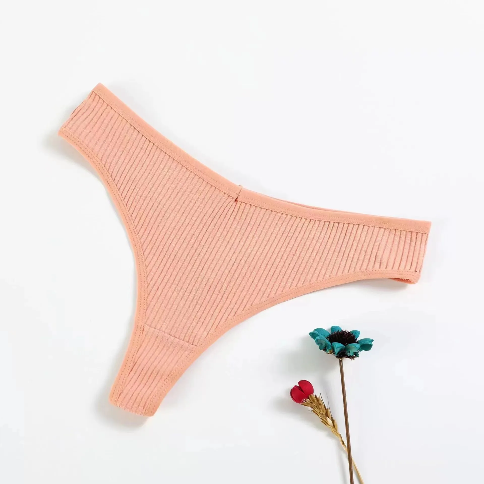 Pure Cotton Tempting Sexy Fun Women's Thong Underwear Solid Color T-pants Ribbed Triangle Panties Knitted Plain Dyed Waist