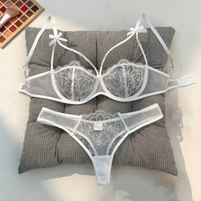 Japanese Erotic See-through Lace Embroidery Floral Women's Two Piece Bra&briefs Romantic Ladies Sexy Hollow Out Underwear Set
