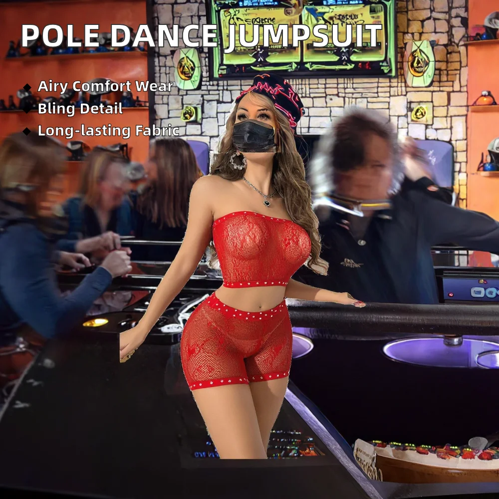 OEM Women's Sexy Pole Dance Bodystocking New Clubwear Two-Piece Jumpsuit with Rhinestone Crystal Lingerie for Parties