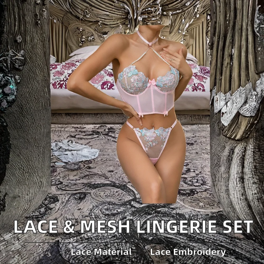 Sexy Mature Tube Lingerie Transparent Mesh Lace Floral Embroidered Bodysuit Firm Control G-string Underwear Set