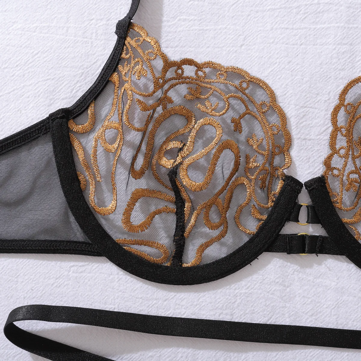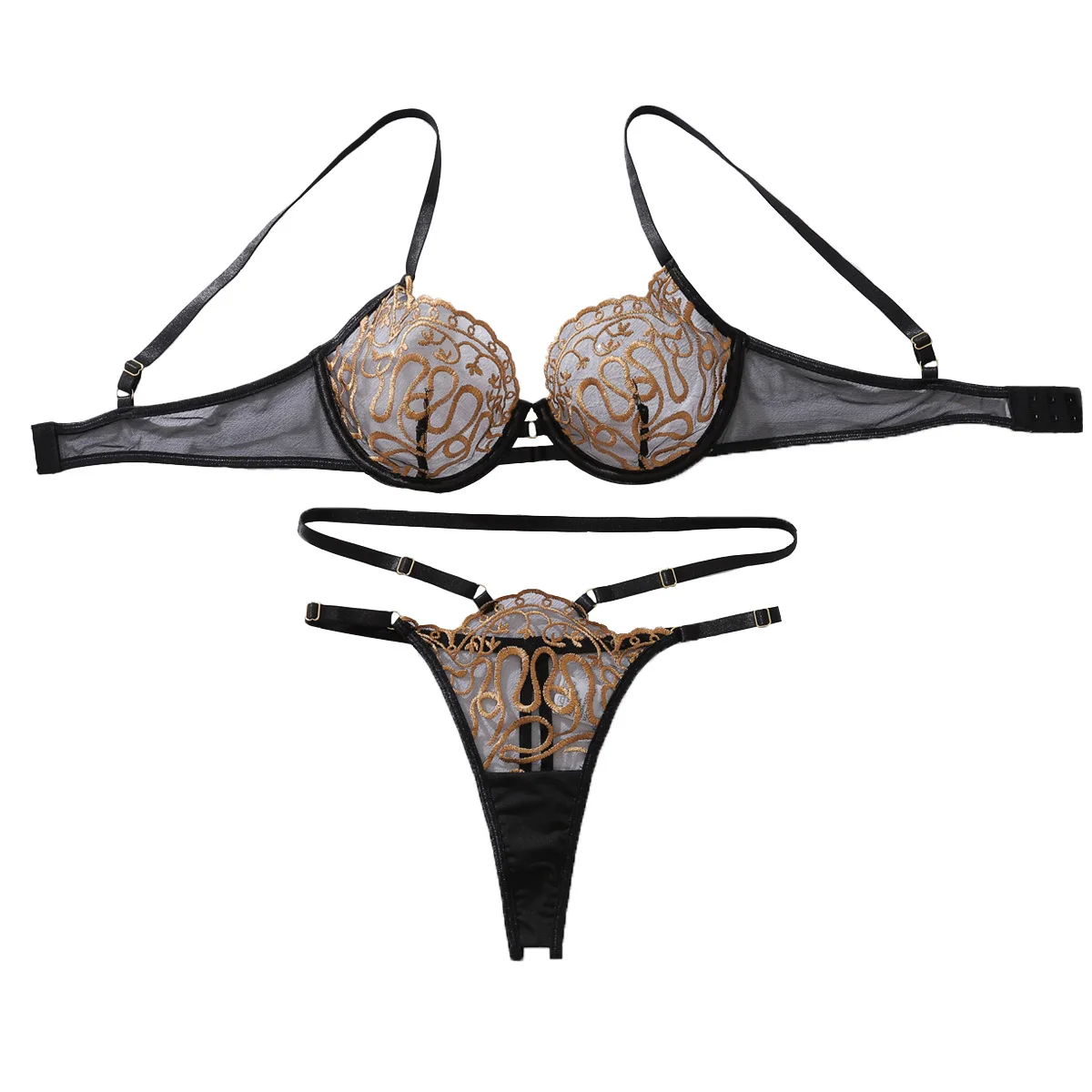 In Stock 2026 Sexy Lingerie Sheer Embroidery Lace Transparent Push up Bra Thong Garters Lingerie Women High Quality
