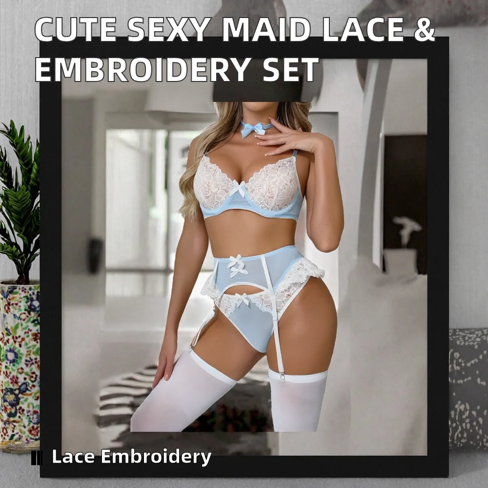 European American Cute Sexy Maid Intimates Set Womens Crocheted Lace Mesh Embroidery Decoration Underwear Breathable Polyester