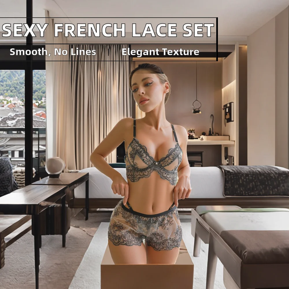 French Lace Cross-Border Sexy Ladies Underwear Set Thin Mesh See-Through Embroidery Craft Hollow Shorts Seamless Breathable