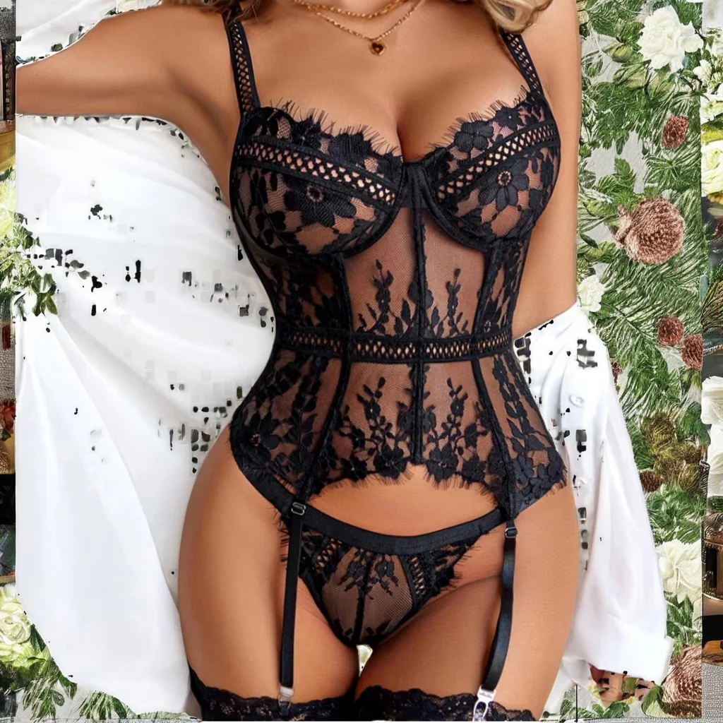 VK404 Sexy Women's 2-Piece Lingerie Bodysuit & Dress Thin Lace Bow Embroidery Mesh See-Through Set