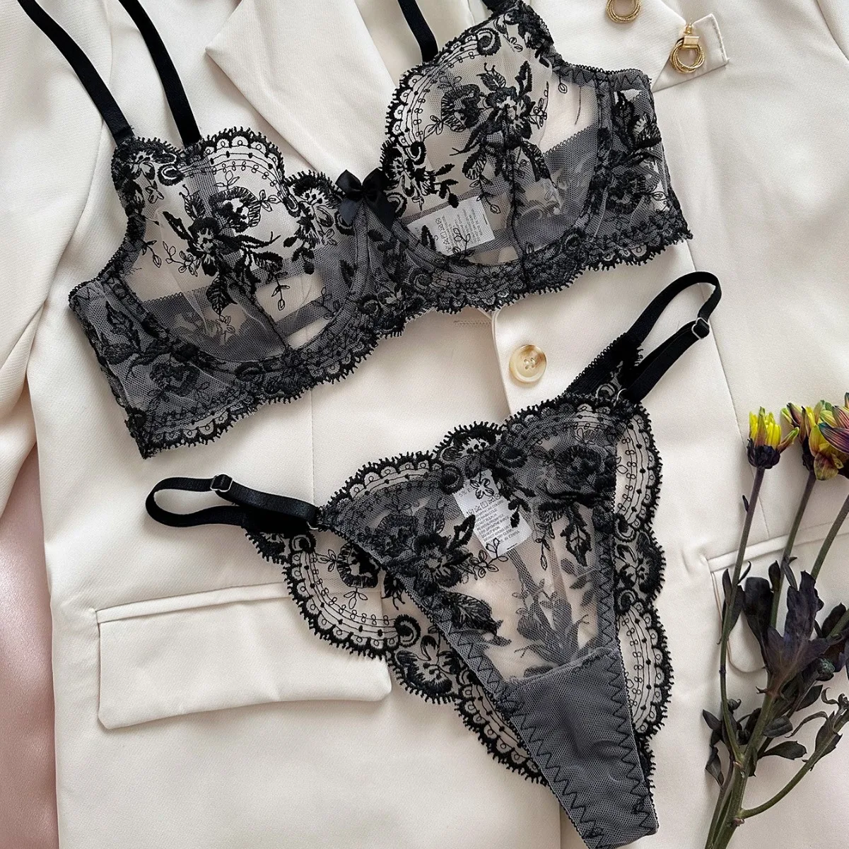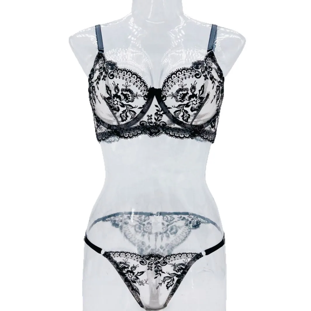 Cross-border Hot-selling Floral Embroidery Sheer Mesh ODM Dobby Fabric Sexy Comfortable Simple Push-up Lingerie Set