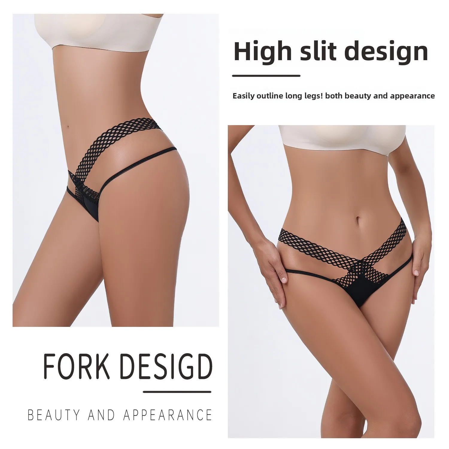 Women's Sexy Hollow Lace Thong Panties Breathable Fishnet Cross Straps Low-Waisted T-Back Lingerie with Bondage Features