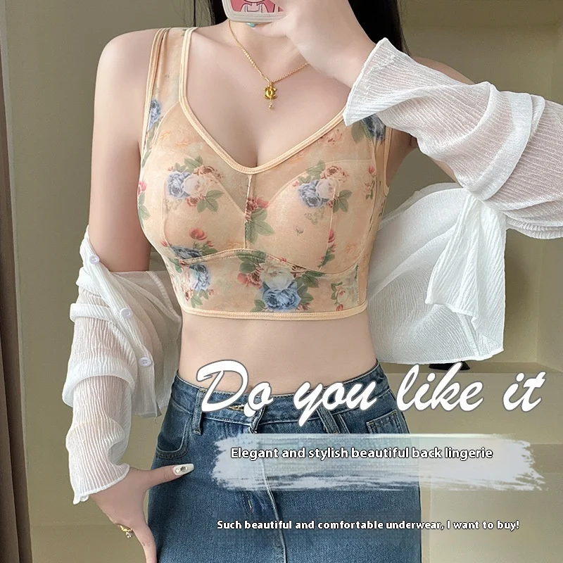 Large Thin Lightweight Women's Floral Printed Bra Comfortable Wire-Free Vest Style Lace Knitted 3/4 Cup Breathable Middle-Aged