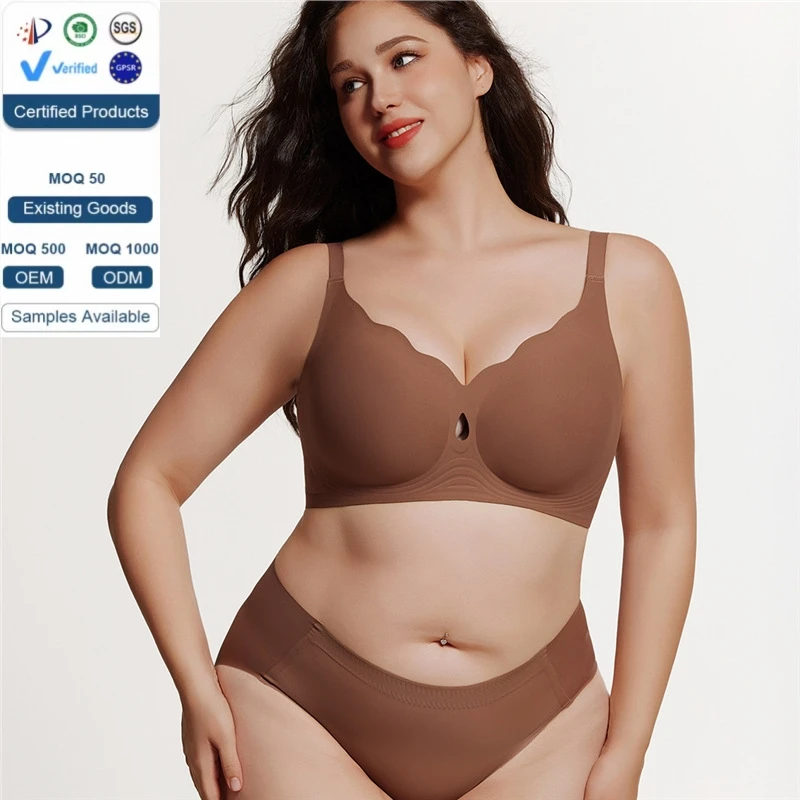 Customized Logo Seamless Plus Size Wireless Bra for Women Push up Bralettes Ladies V Neck Full Cup Padded Scalloped Bras