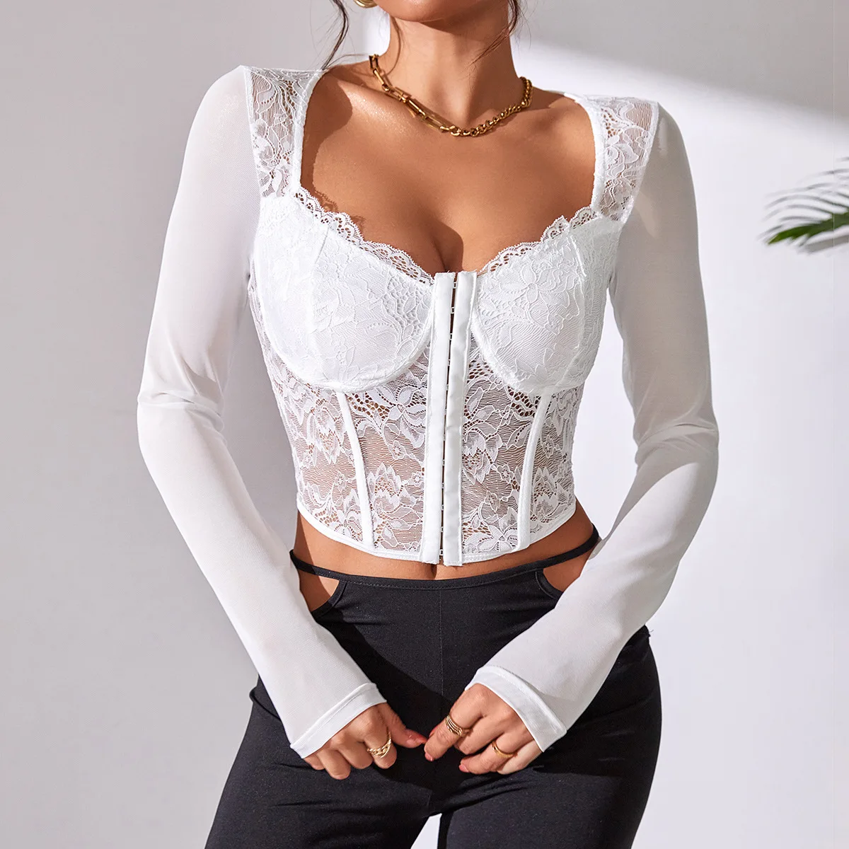 OEM/ODM Ladies Fashion Long Sleeve Corset Top for Women Sexy Lace Embroider Bustier Crop Top Women Corset