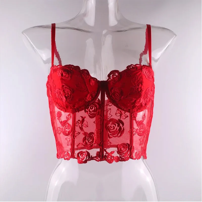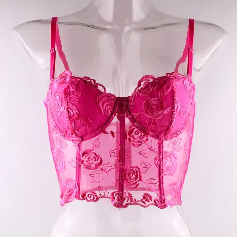 Rose Embroidery Fish Bone Chest Vest Women's Underwear Sexy Lingerie Lace Corset Tops With Shoulder Strap