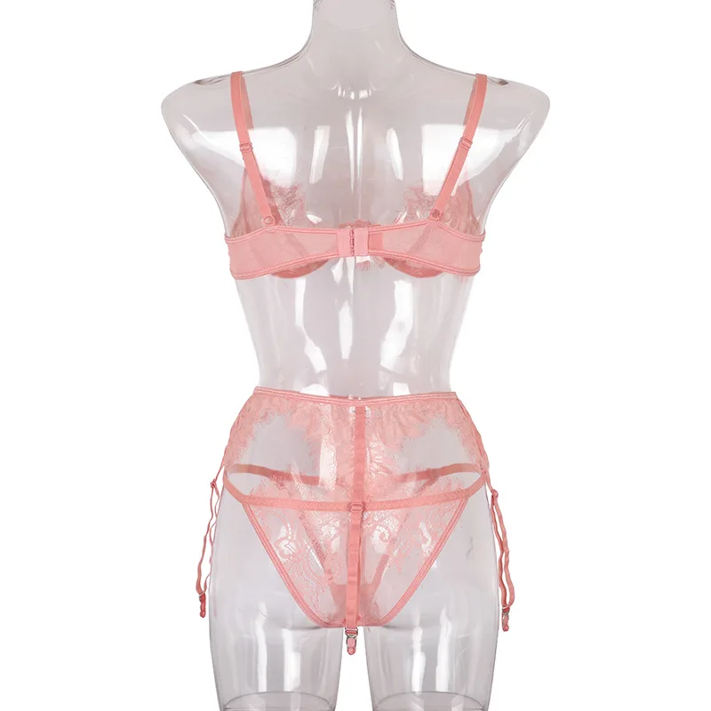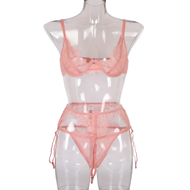 Erotic Lingerie Intimates Bra Sets Transparent Lingerie Pink Lace Eyelash Three-Piece Lingerie