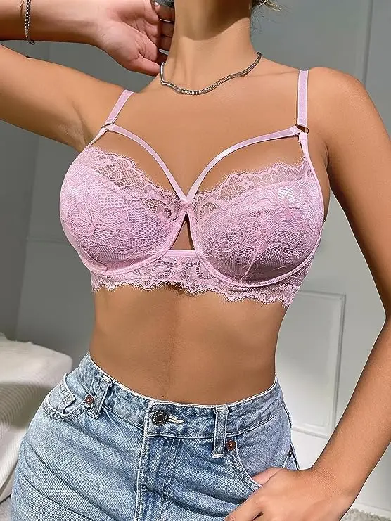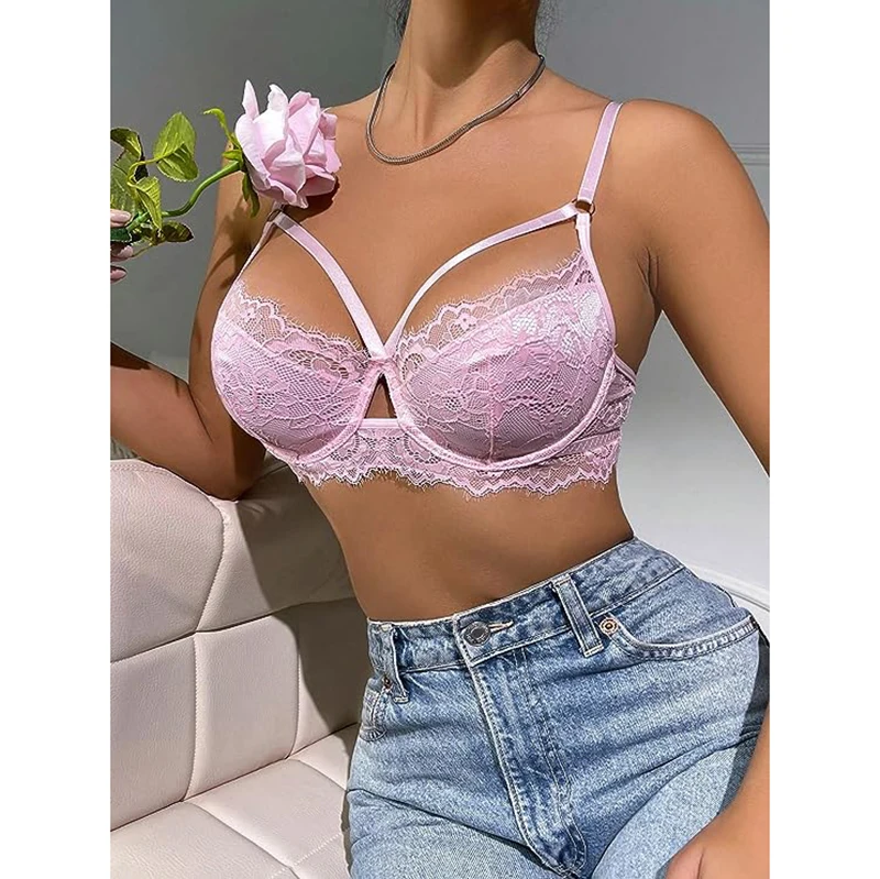 Women Lace Cut Out See Through pink Erotic Sexy Lingerie Transparent Lace Bra