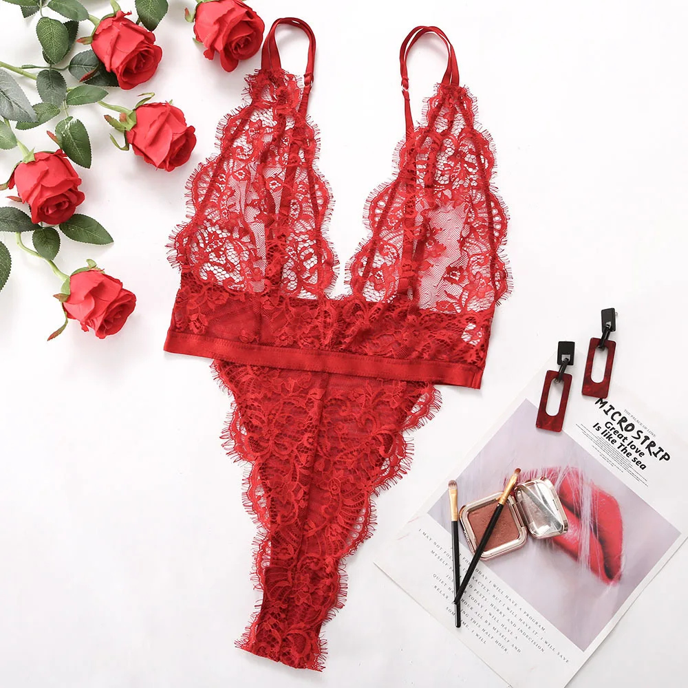 Custom Women Sexy Underwear One Piece High Waist Transparent Bodysuit Open Tight V-neck Red Temptation Sexy Lingerie Corset Top