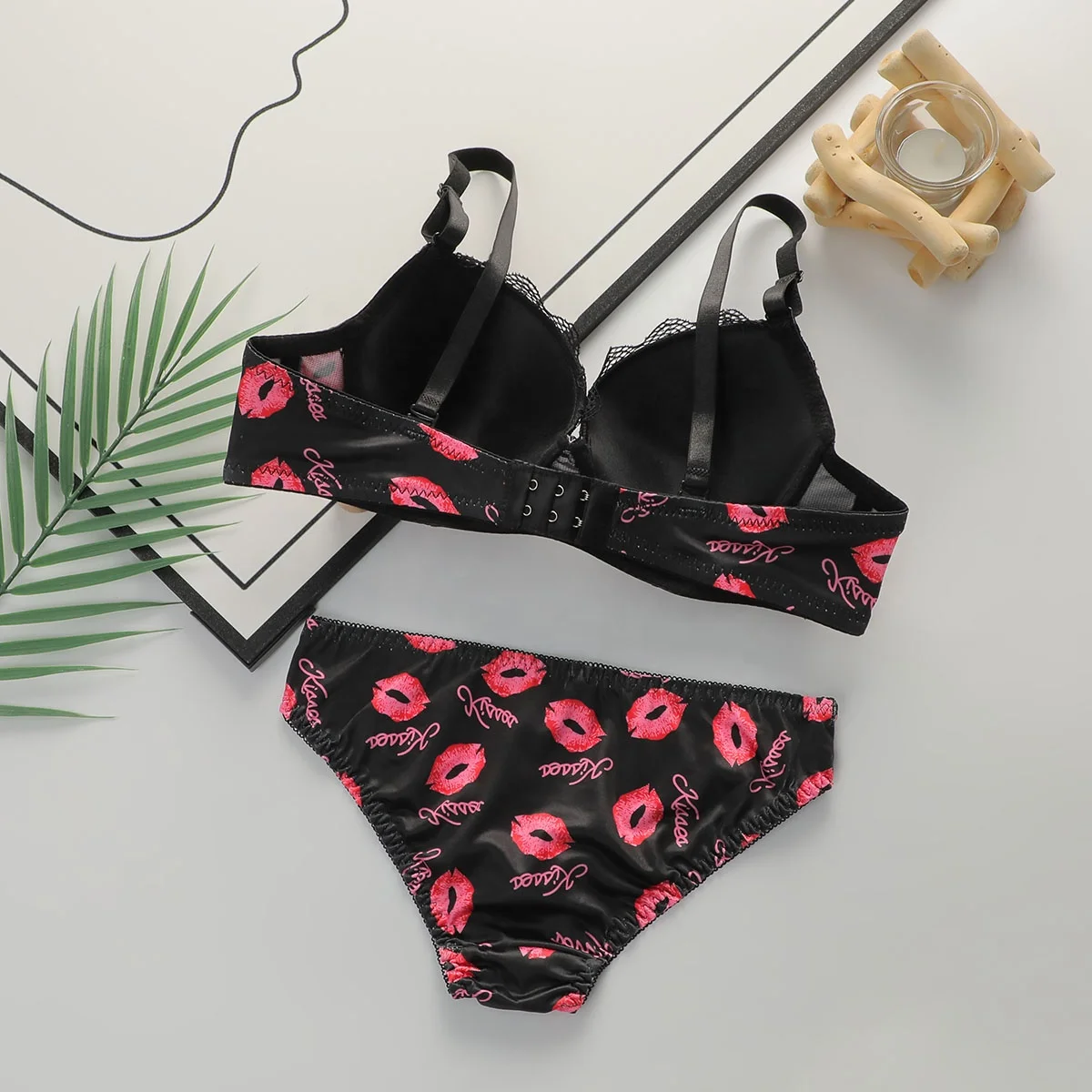 Hot Popular Women Bras and Panties Set New Design Black Lips Printed Panty Bra Sexy Underwear