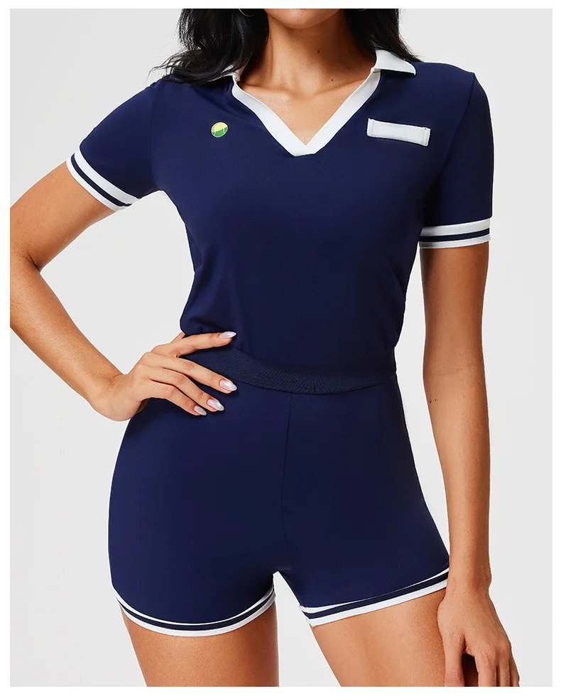 New Women Color Blocking Short Sleeves V-Neck Polo Workout Gym Bodysuits with Pockets Sports Wear Fitness Yoga Navy Jumpsuit
