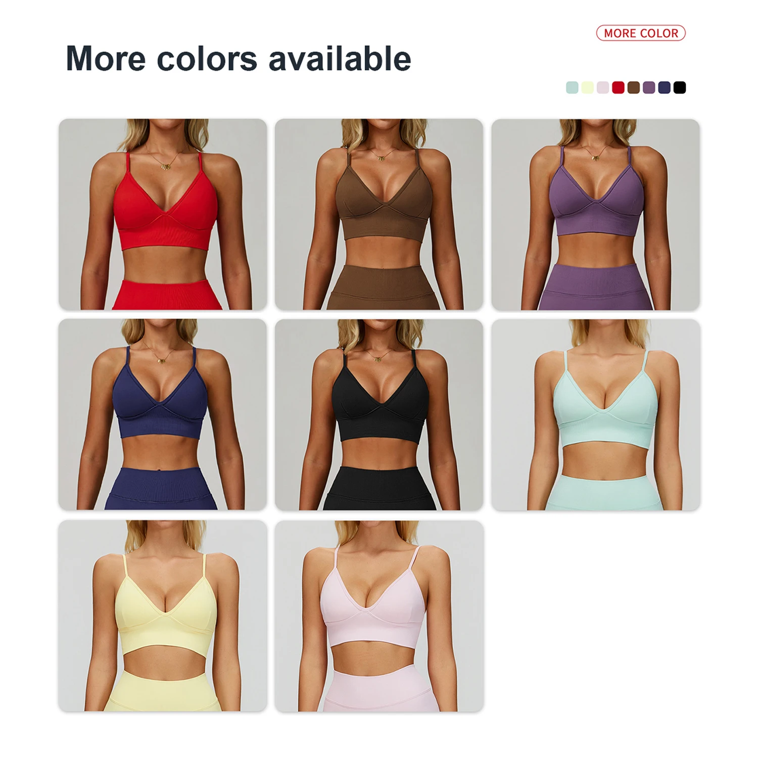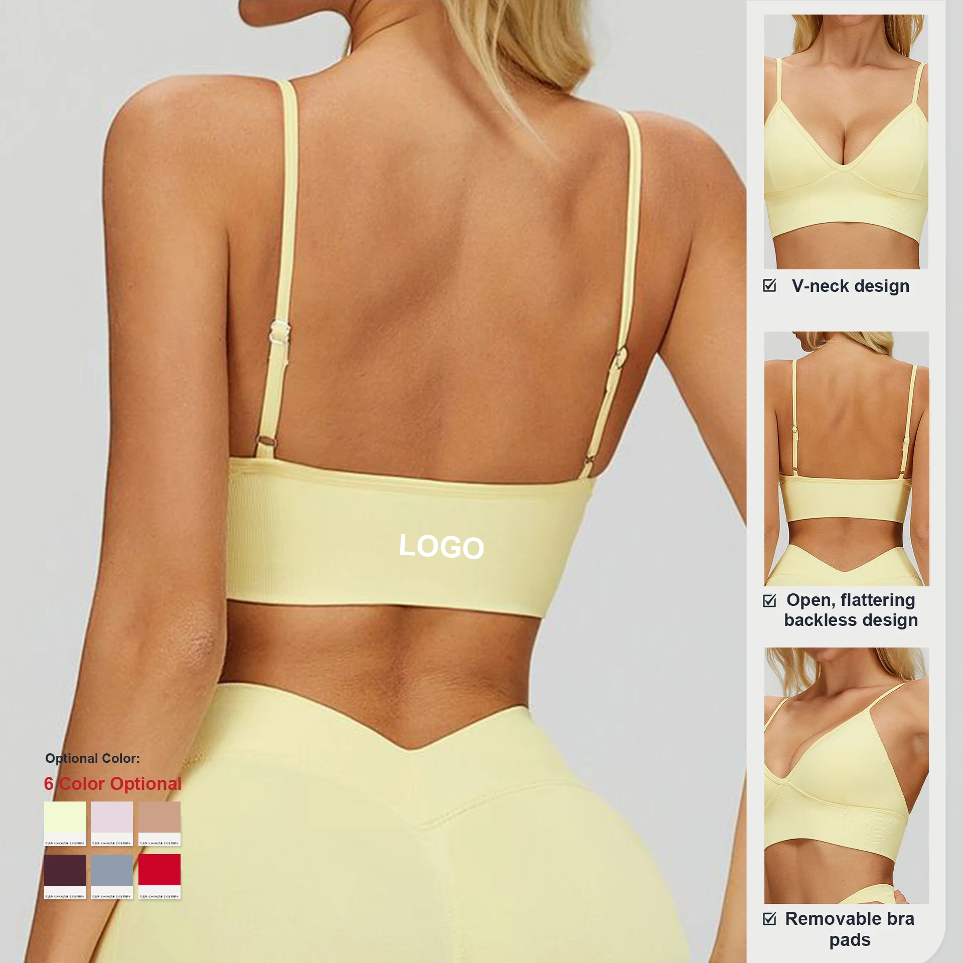 Custom Fabric Style Color Logo Quick-Drying Thin-Strap Deep V Sports Bra Sujetador Deportivo Women Gym Running Fitness Sport Top