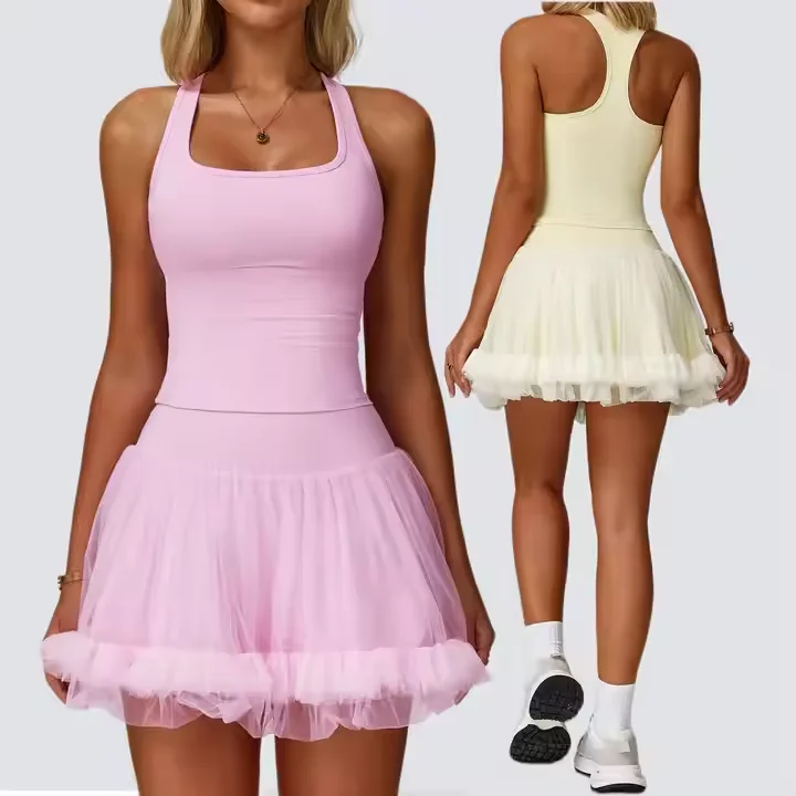 Bnice Women Custom Logo Tennis Wear Summer Tennis Bubble Skirt Halter Vest Built-in Short Dress for Golf & Fitness Sportswear