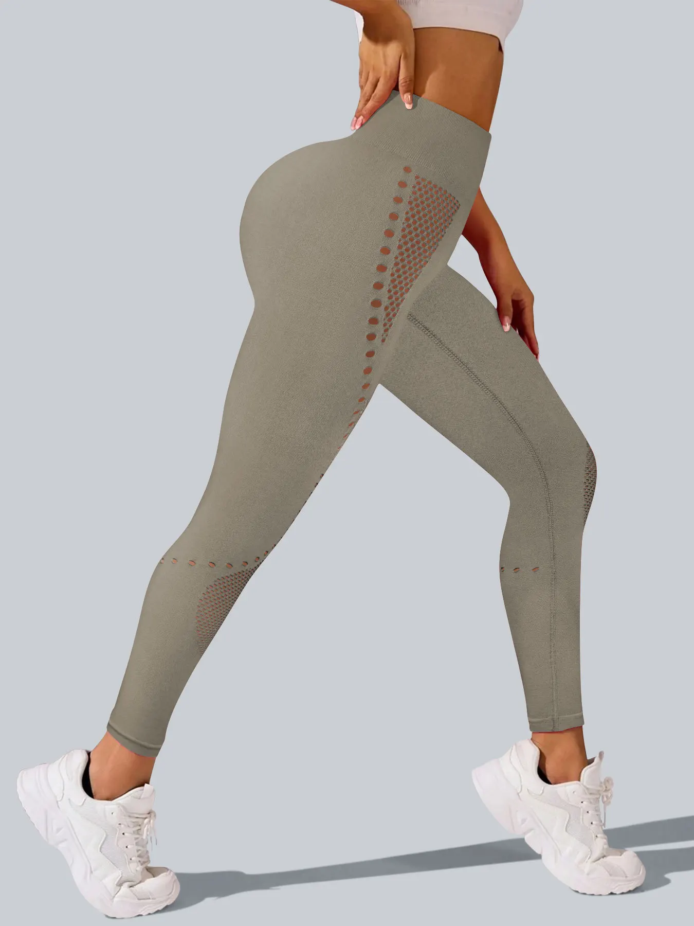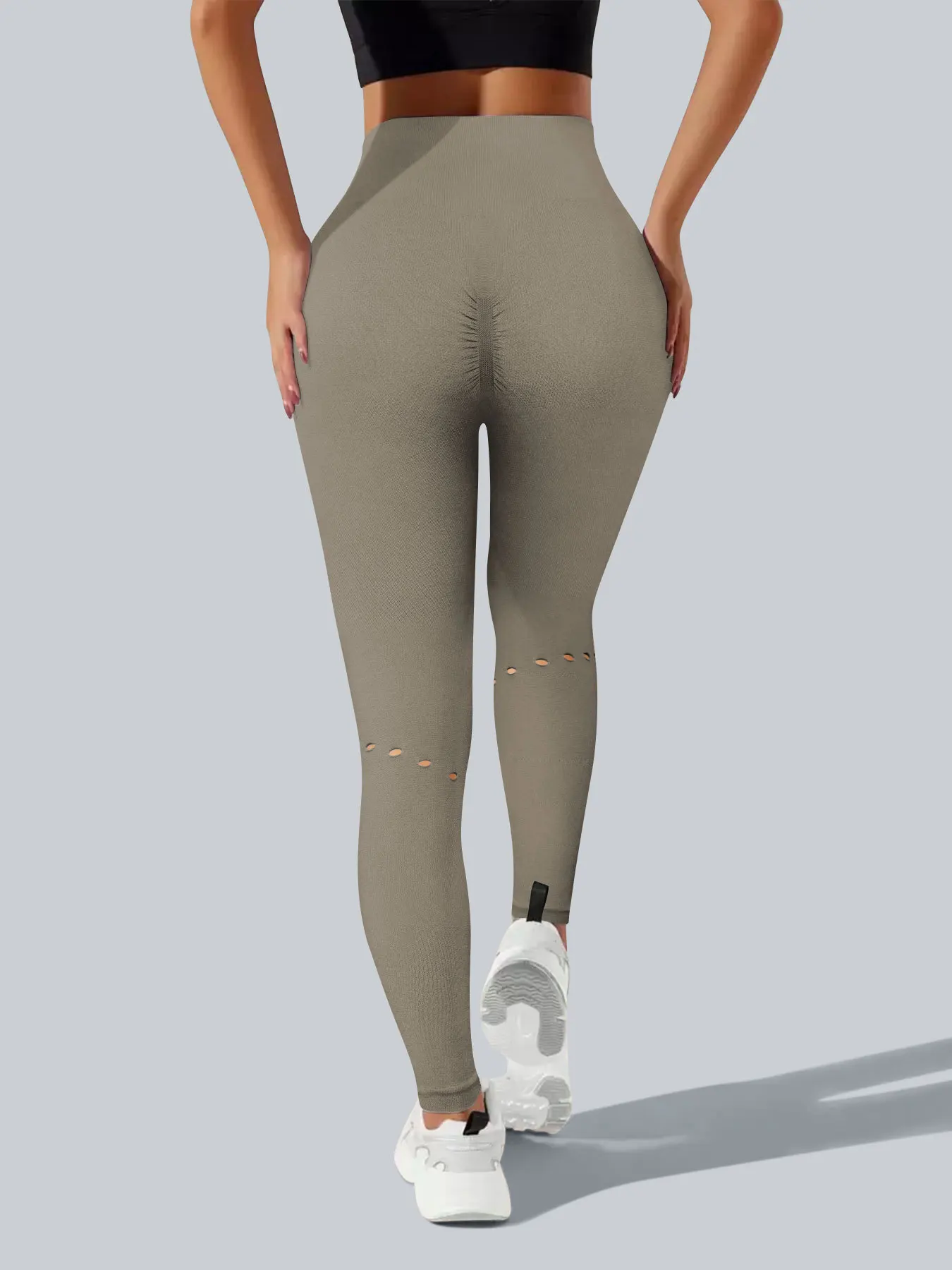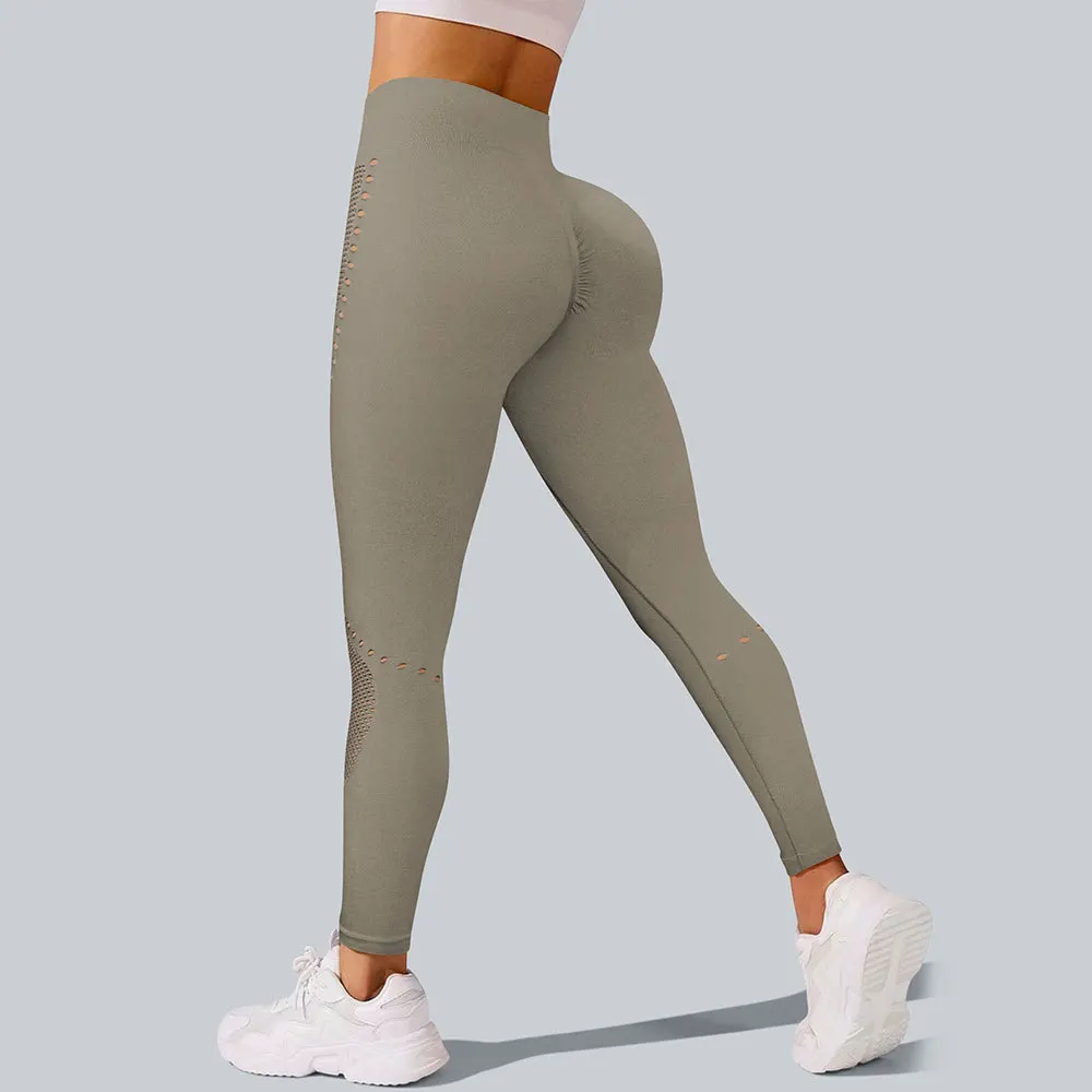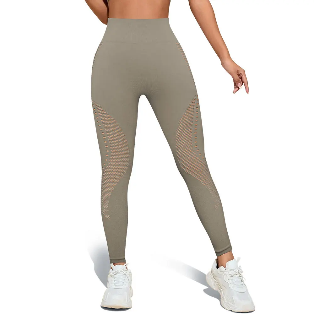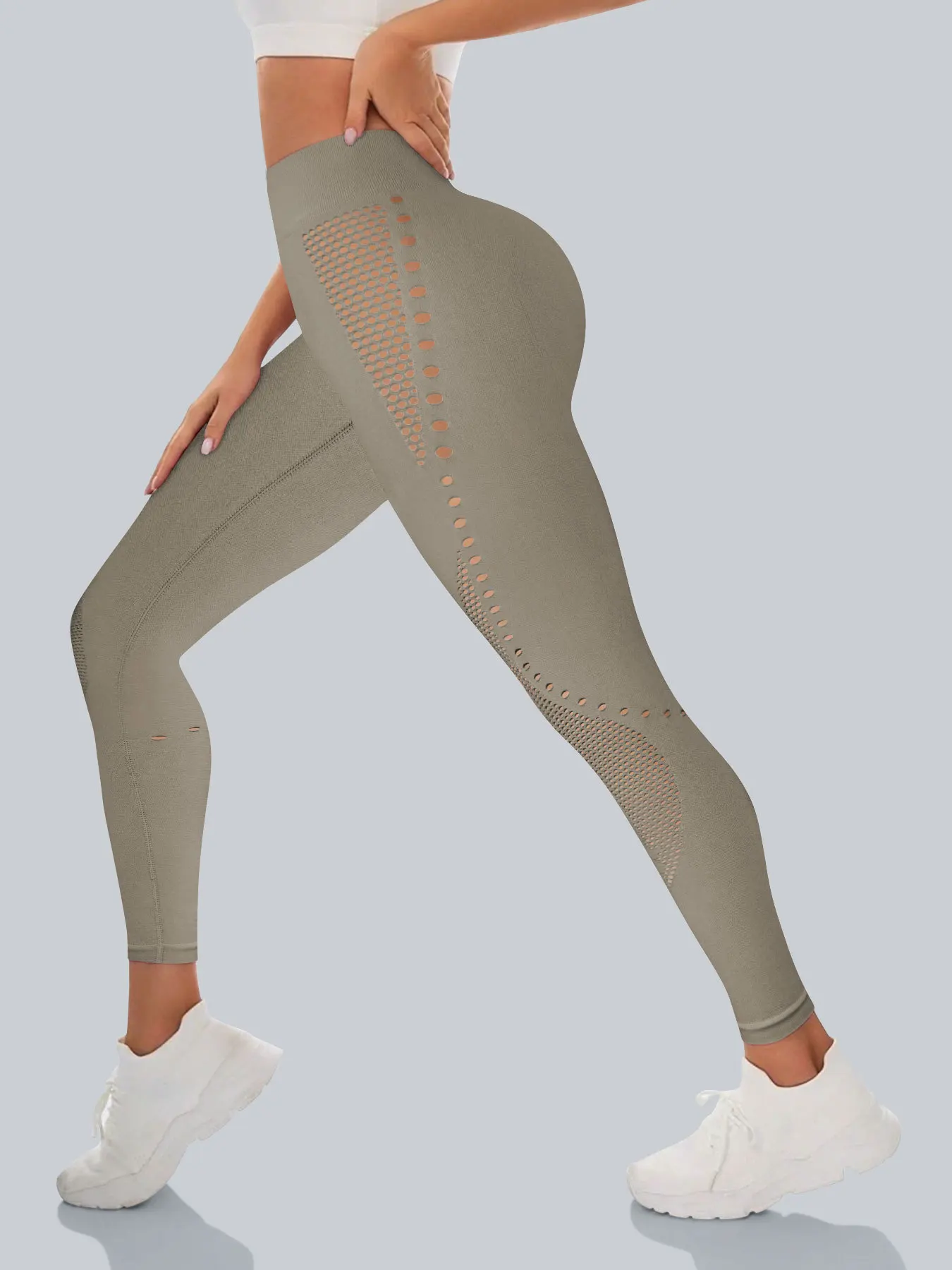 Women's Camel High Waist Yoga Leggings with Side Cutouts Distressed Holes Booty Lift Design Breathable and High Stretch