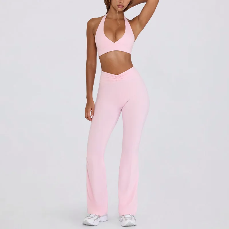 New Arrival Plus Size Solid Slim Fit Leisure Sports Fitness Gym Set Sexy Bra Flared Pants Yoga Elastic Waist Front for Women