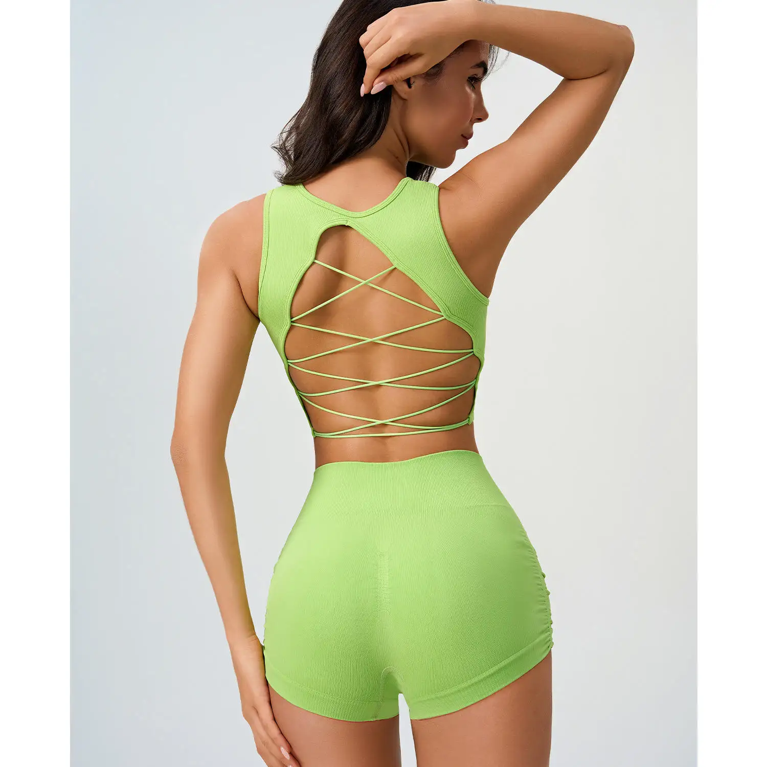 Sexy Sleeveless Cross Back Tank Top Ribbed Soft Ribbed Seamless Scrunch Yoga Shorts Simple Gym Fitness Work Out Sets for Women