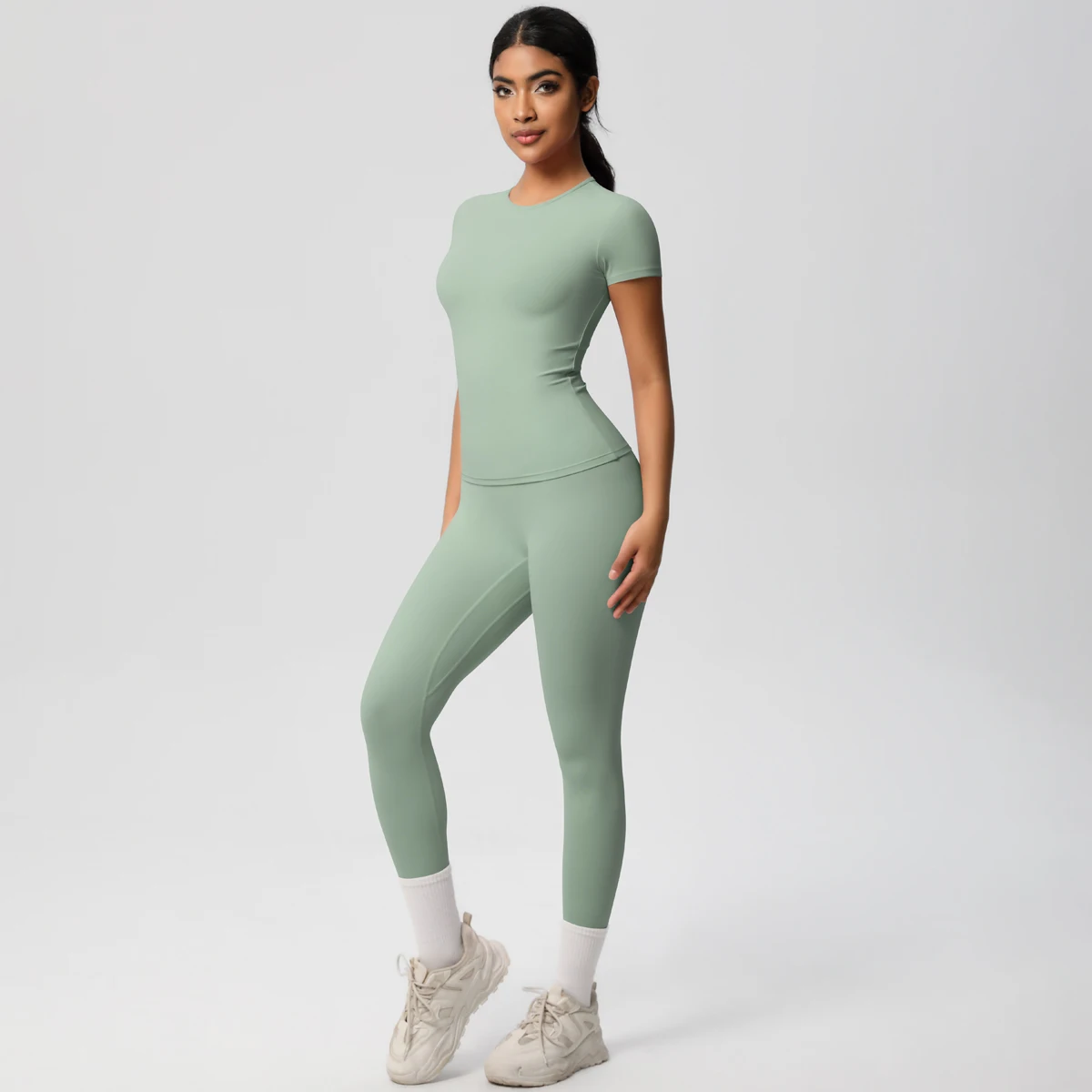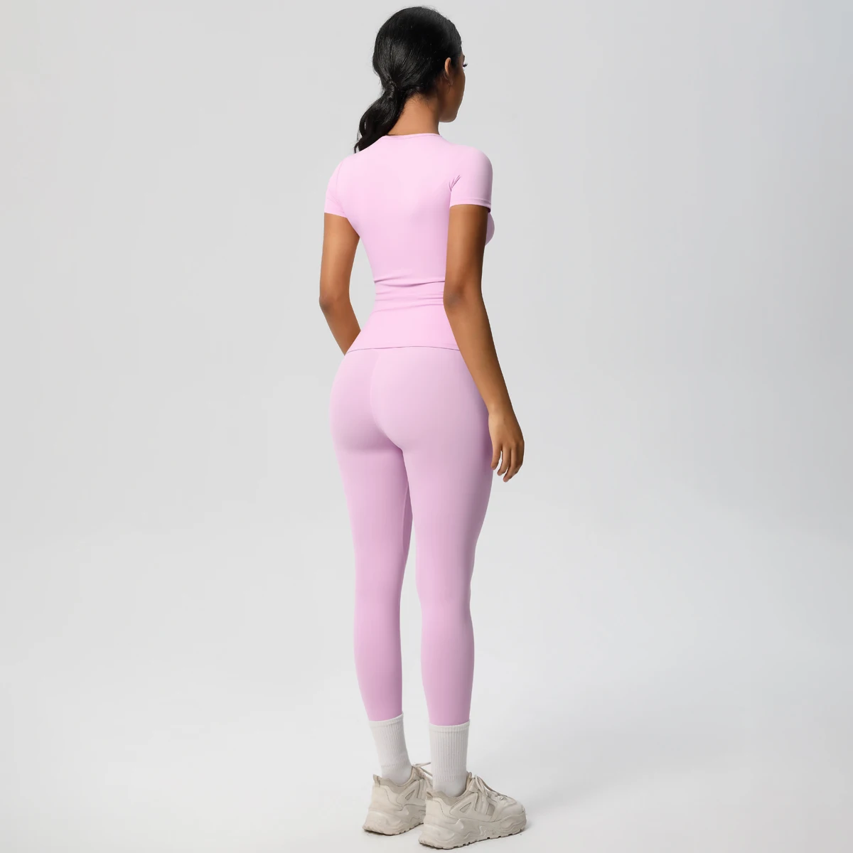 2026 Custom Yoga Gym Legging Set for Women Breathable 2-Piece Activewear Fitness Top Leggings Logo Front Short Sleeves Solid