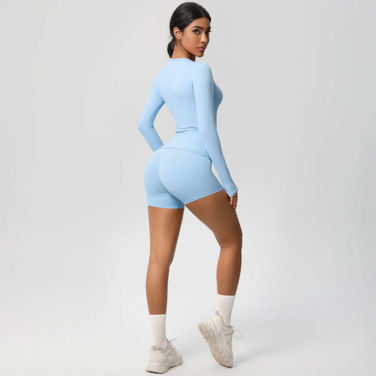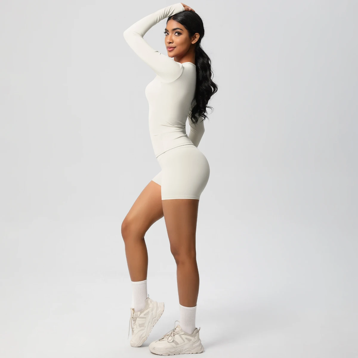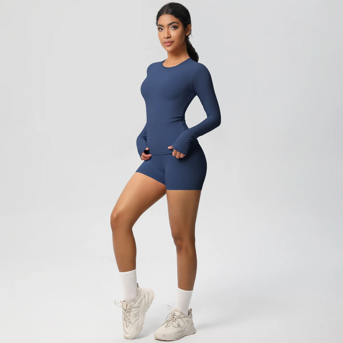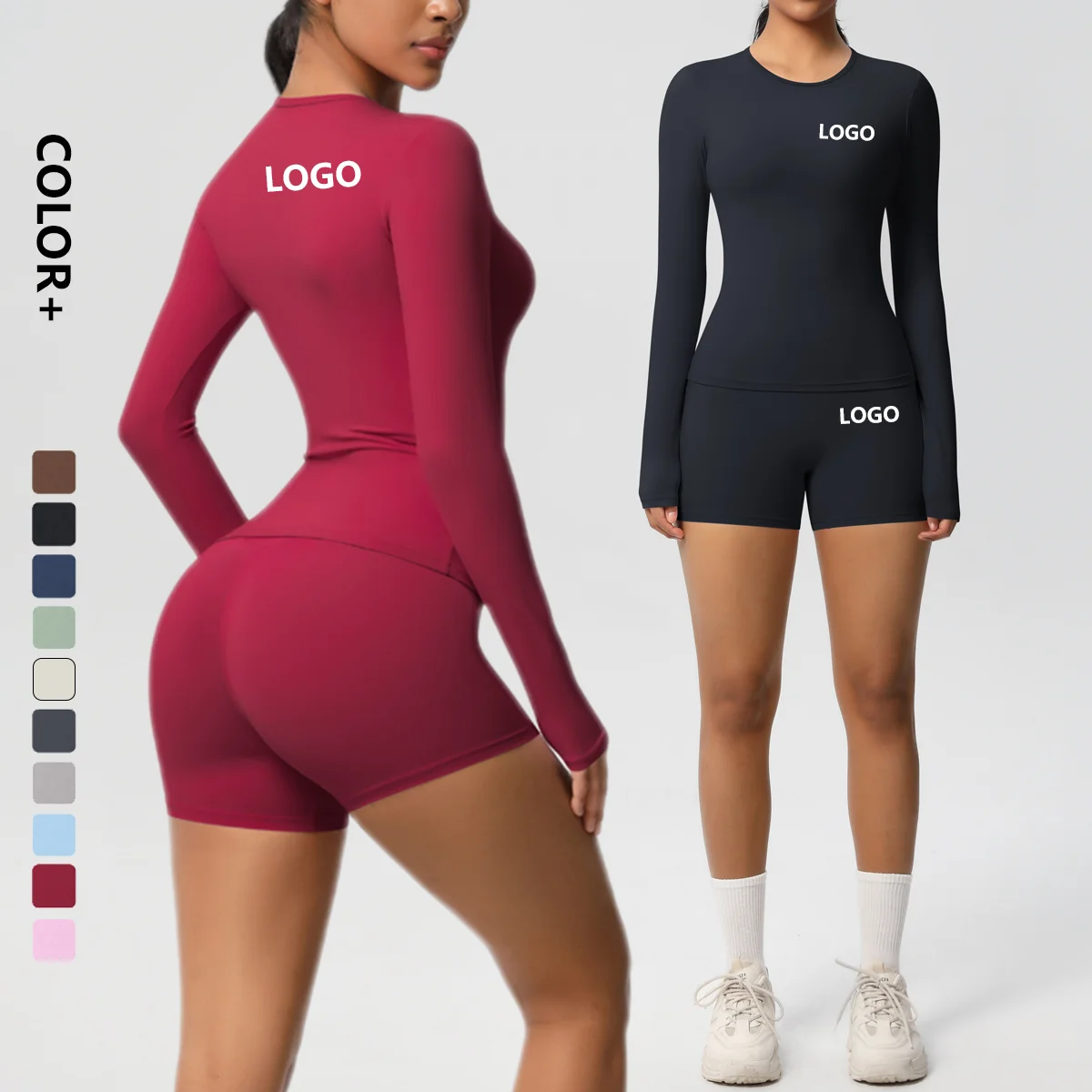 Custom Crop Top Shirt and Short Legging Yoga Sets Women Fitness Gym Workout Biker Shorts Set Long Sleeve Shorts Set