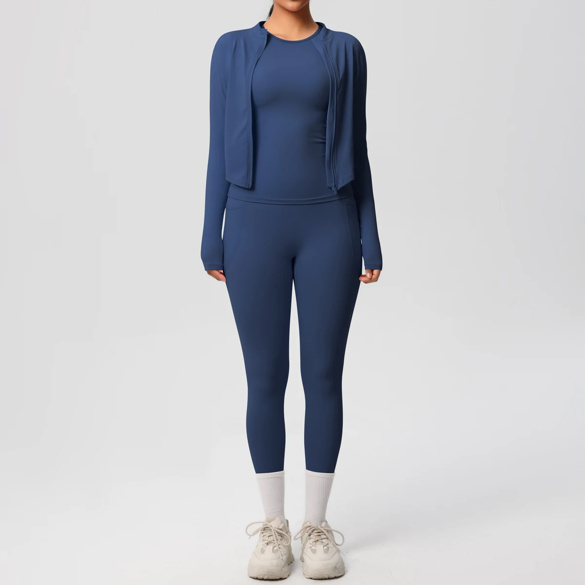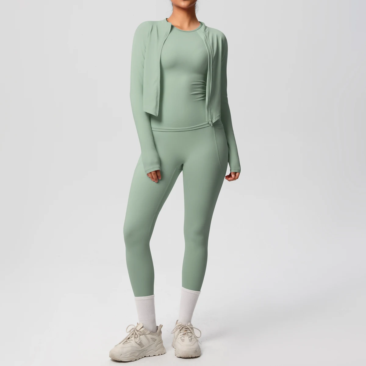 Lightweight Sports Fitness Zip-up Outerwear Set Solid Color Short Sleeve Yoga Compression Leggings Skin-Friendly Breathable