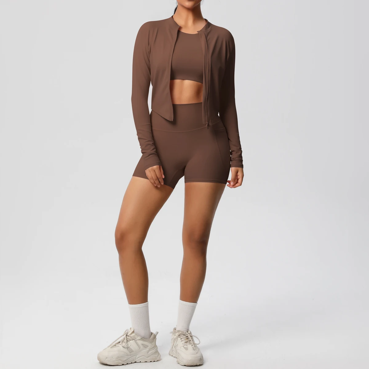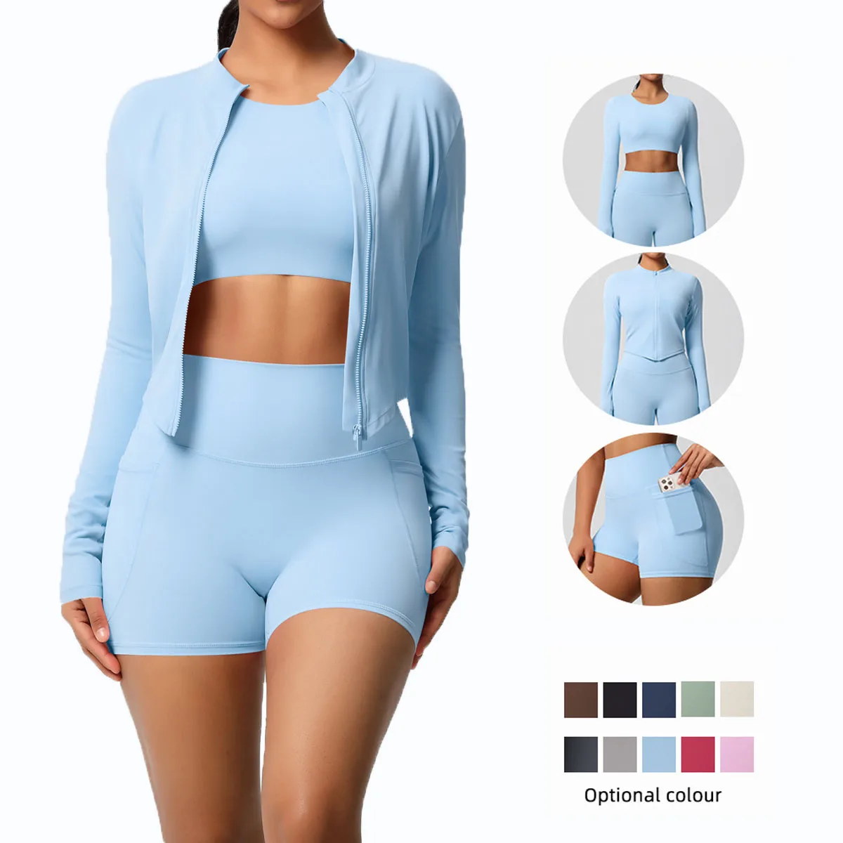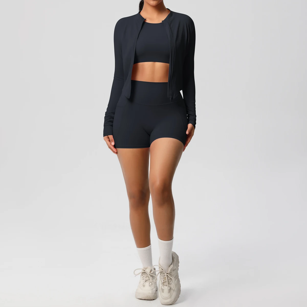 Women's Casual Yoga Set Long Sleeve Zipper Jacket Pocket Shorts Solid Pattern Breathable Three-Piece Set 'New Naked Feeling'