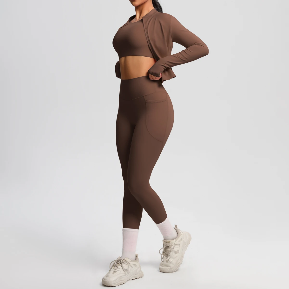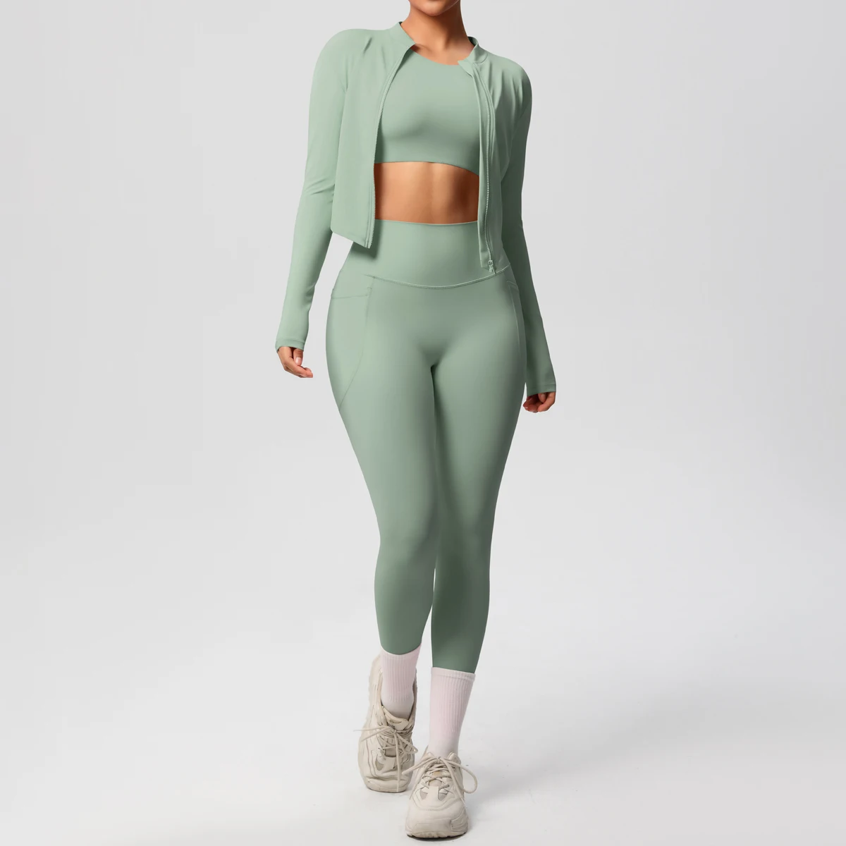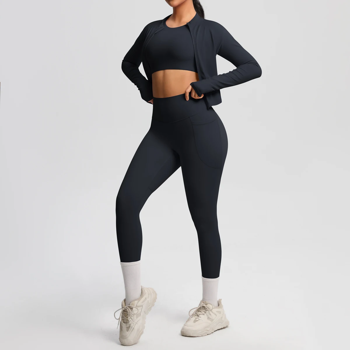 3 Piece Yoga Outfit Set Yoga Pants with Pockets Short-sleeve Top and a Zippered Long Sleeve Yoga