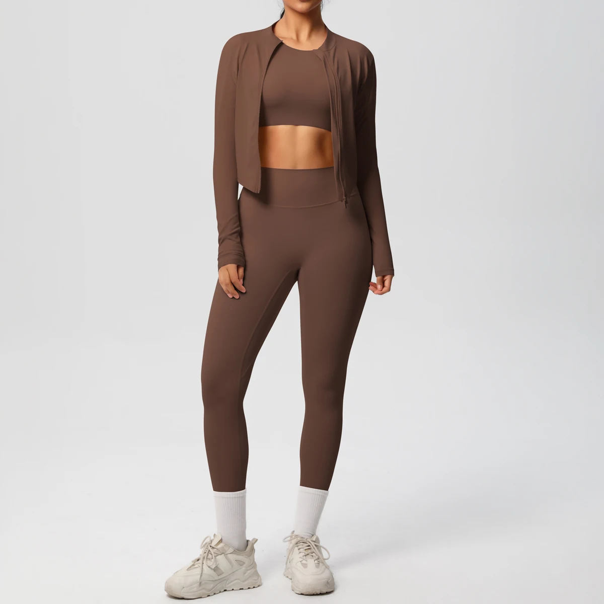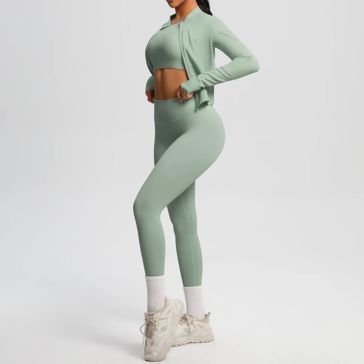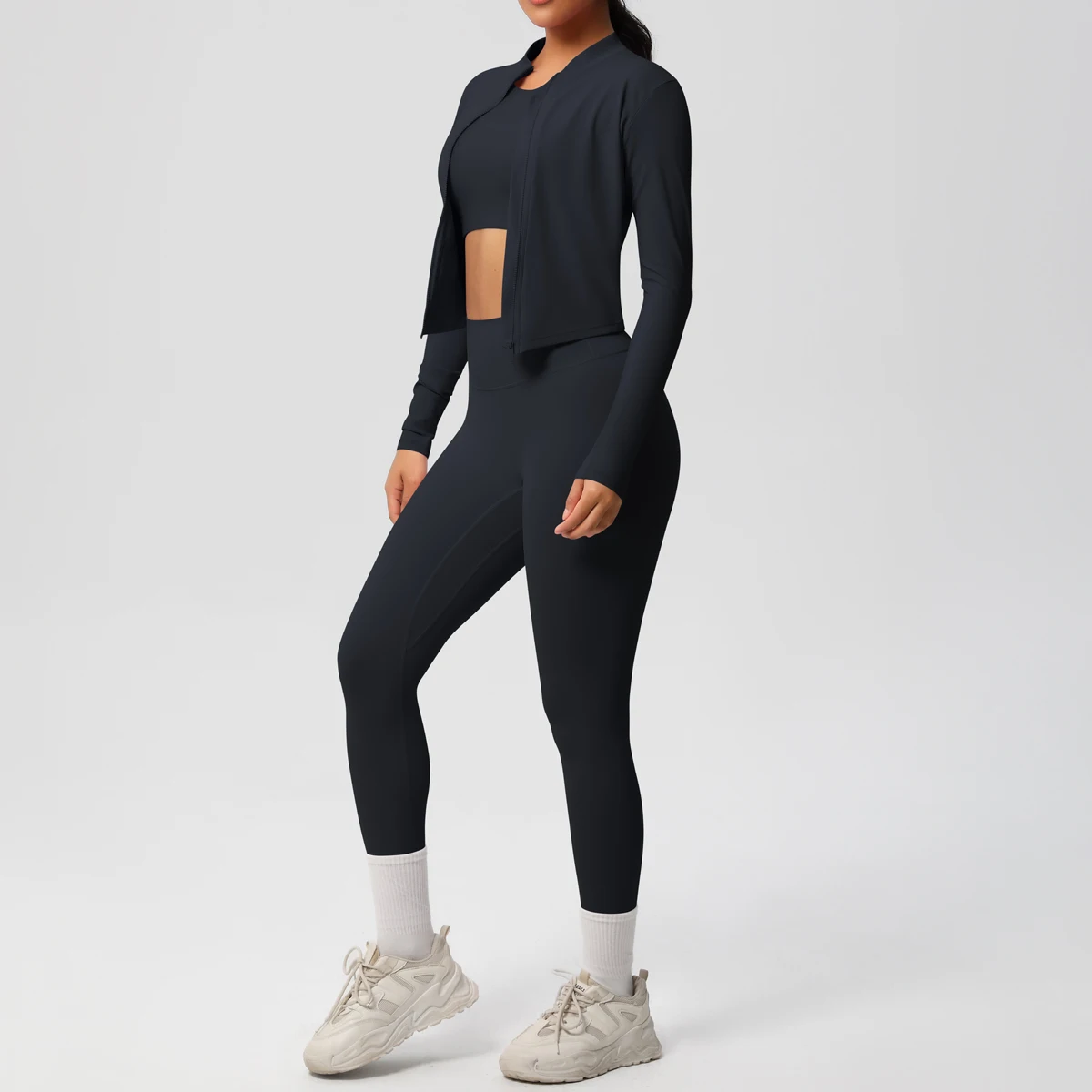 High-Waisted Zip-Up Long Sleeve Cardigan and Exercise Yoga Pants Set Breathable Solid Pattern Fitness Three Piece Outfit